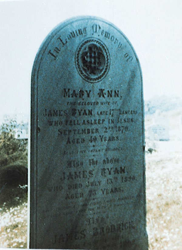 From other known inscriptions on his gravestone, it would appear that he had married twice, his second wife being the Jane Ryan, aged 60, shown on the Census Return for 1881. The last inscription refers to her: "Also Jane, widow of the above James Ryan, who died April 29th 1894, aged 73 years."