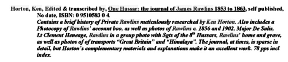 James Rawlins also managed to retain his "Conduct Sheet" by some means (see copy in the 8th Hussar file), which shows him as being charged at various times with a variety of offences. (See also a copy of his discharge certificate from the Yorkshire Hussars Yeomanry, a copy of his pay book, and a portrait of him in civilian clothes in the 8th Hussar file.)