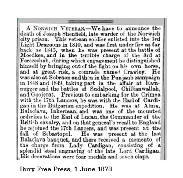 In an Account and Address Book formerly used by James W. Wightman when the Secretary of the Balaclava Society, the name "Shenfield" has been added at the bottom of the list of 17th Lancer members (post 1879) and the words "Not entitled". Shenfield's death in 1878 would have excluded him from entry on any subsequent list anyway.