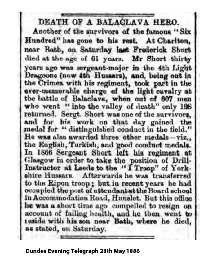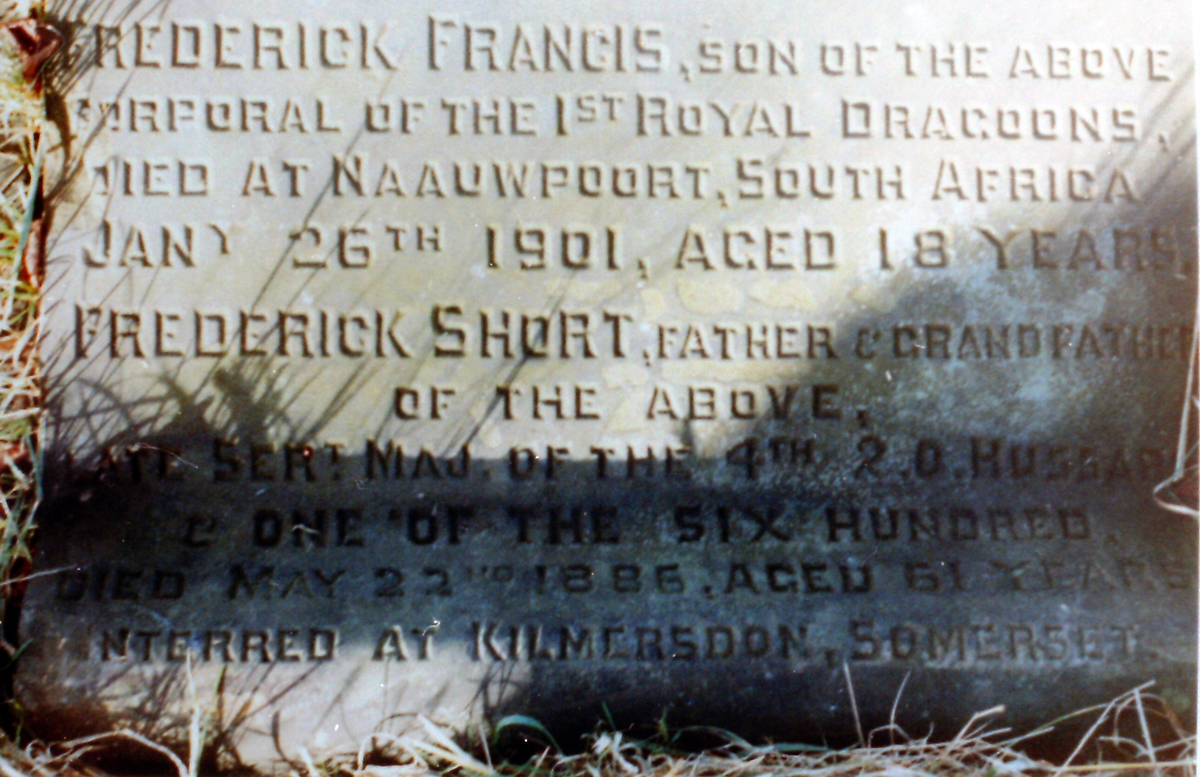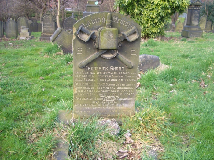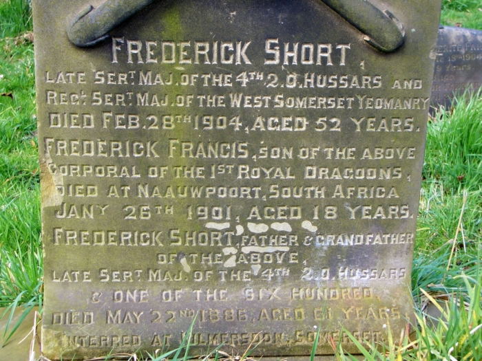 and Frederick Short, father and grandfather of the above, late Serg. Major 4th Q.O. Hussars & One of the 600, died May 22nd 1886 aged 61 years. Interred at Kilmeredon Somerset.