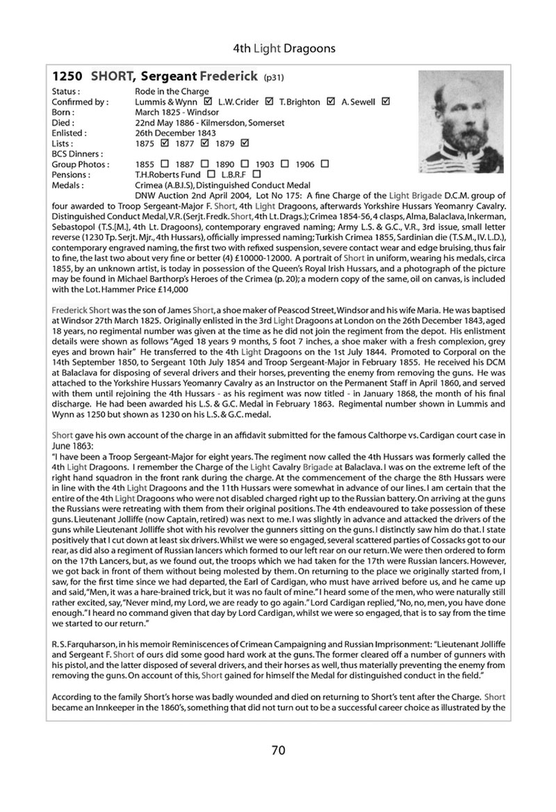 Frederick Short was born in Windsor and enlisted in the 3rd Light Dragoons in December 1843 aged 18 years. In the following year he transferred to the 4th Light Dragoons. He attained Sergeant in July 1854 and served with distinction in the Crimean war and in particular in the famous charge of the Light Brigade, when he dispatched several enemy artillery drivers with his sword, a fact confirmed by 4th Light Dragoon, R. S. Farquharson, 'Lieutenant Jolliffe and Sergeant Frederick Short did some good hard work at the guns. The former cleared off a number of gunners with his pistol, and the latter disposed of several drivers, and their horses as well, thus materially preventing the enemy from removing the guns'.