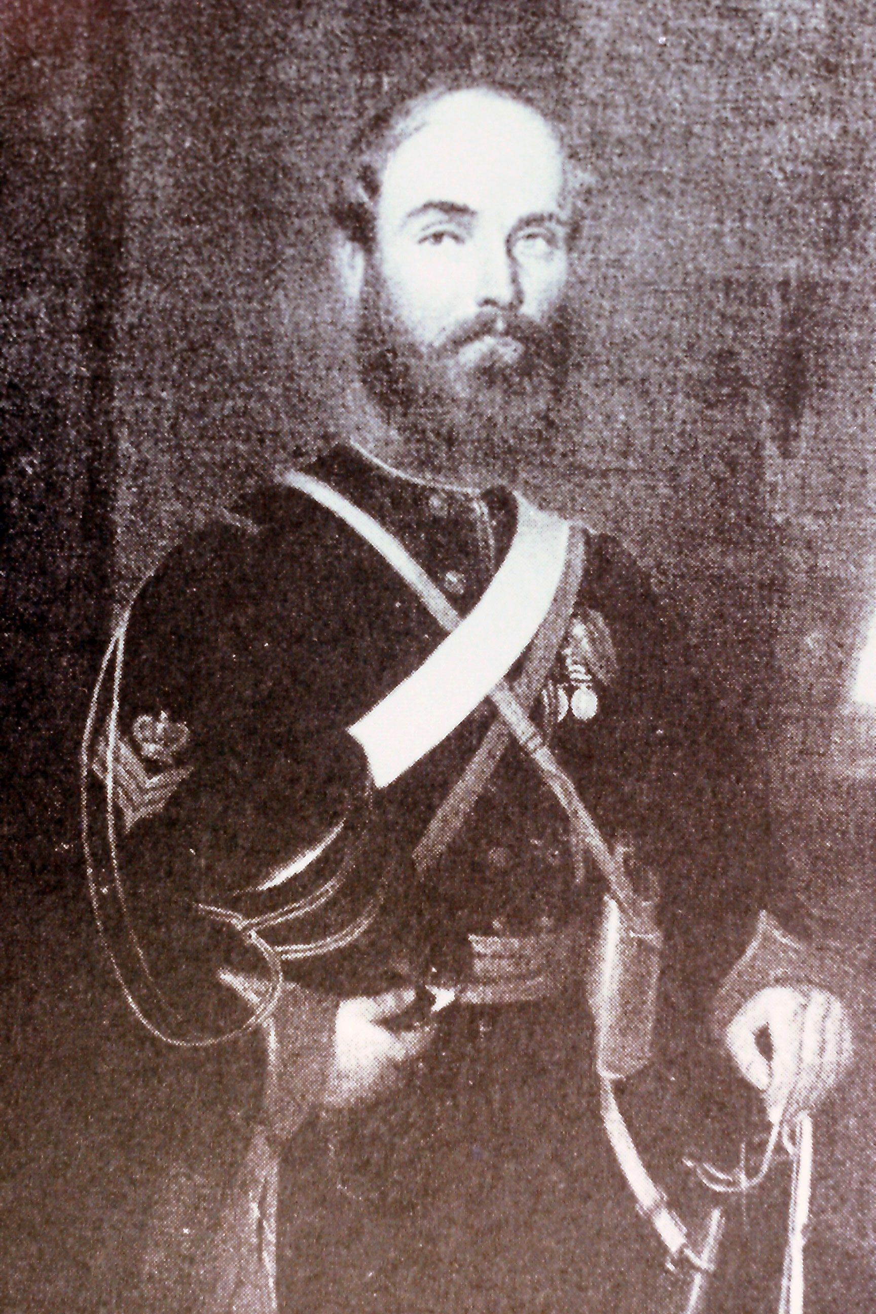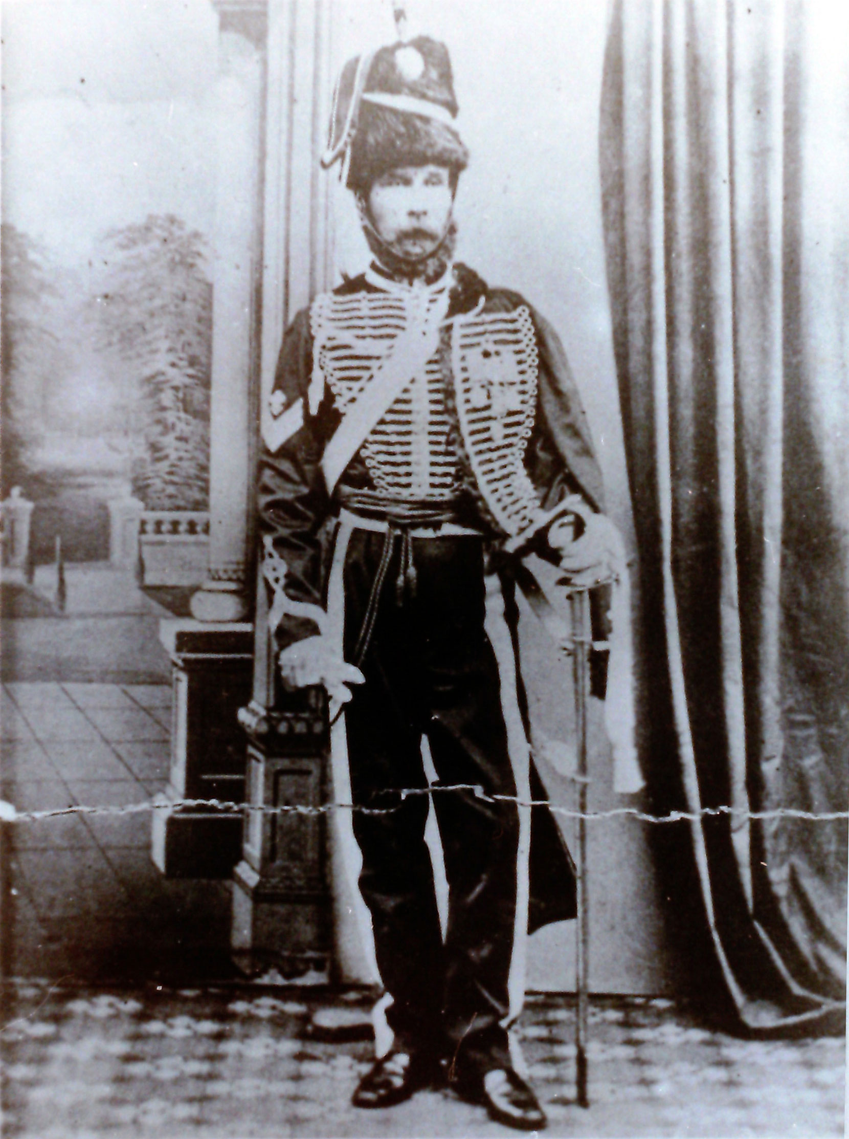 The uniform he is wearing in the photograph is now believed to be that of the 10th Hussars and not the 4th. This possibly disposes of the theory that this was taken soon after the Crimean War and he probably had this done at a later date, using the photographer's "props".