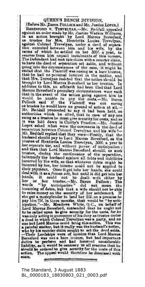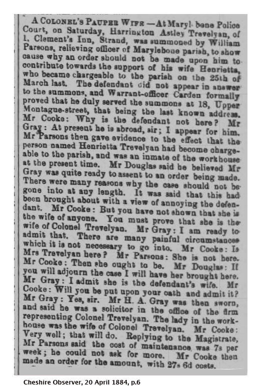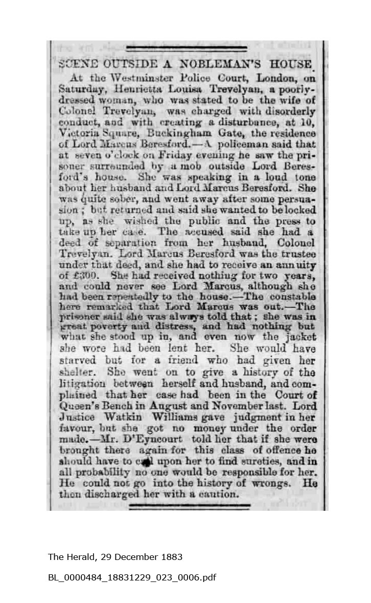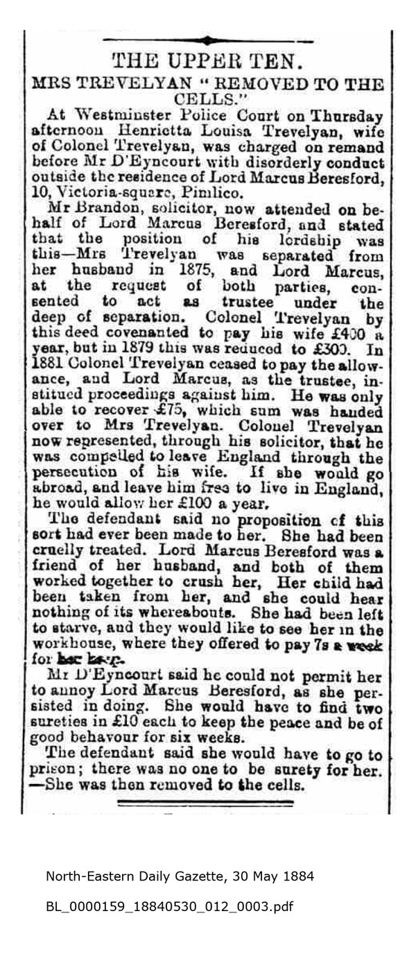 The earliest newspaper report I have come across is from August 1883. Having separated some years previously (probably before 1880), Trevelyan has promised to pay Henrietta £300 a year, to be given to her via Lord Marcus Beresford. Beresford is suing Trevelyan for failing to provide that money. Trevelyan is counter-claiming that he wants the original terms of the separation changed. Clearly Henrietta is demanding that Beresford should provide her with funds anyway, and retrieve them from Trevelyan. She becomes a nuisance, and things get worse.