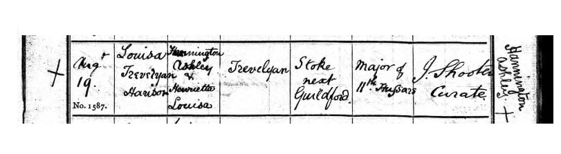 Notice her name is given as "Louisa Trevelyan Harison". Also the marginal clarification that the father's given names, smudged in the 3rd column, are "Hannington Ashley", which is of course wrong. Her father is described as "Major 11th Hussars".
