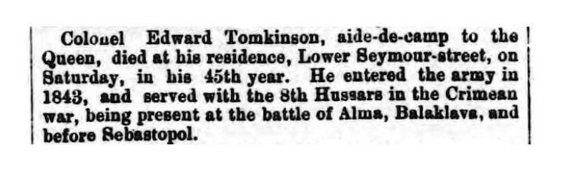 Major Tomkinson served in the Eastern campaign of 1854-55 with the 8th Hussars, including the battles of the Alma, Balaclava (horse killed), Inkerman and the siege and fall of Sebastopol. (Medal and four Clasps, Brevet-Major, Sardinian Medal and the 5th Class Order of the Medjidie.)
