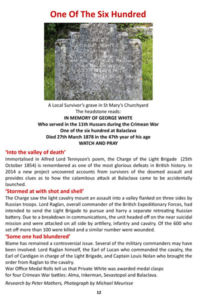 Prior to the discovery of this tombstone by Mike Hinton, all that was known of Private White's life after the war was that he was a member of the 1877 Balaclava Commemoration Society, but not the all-important 1879 group which vetted all members as Chargers. The inscription on his headstone proclaims that he was "One of the Six Hundred at Balaclava" and further notes that he died on 27 March 1878, at the age of 47. While tombstone inscriptions are not always reliable concerning facts stated thereon, the fact that White died in 1878 provides a very good reason for his absence from the list of the 1879 Balaclava Commemoration Society [Ed].