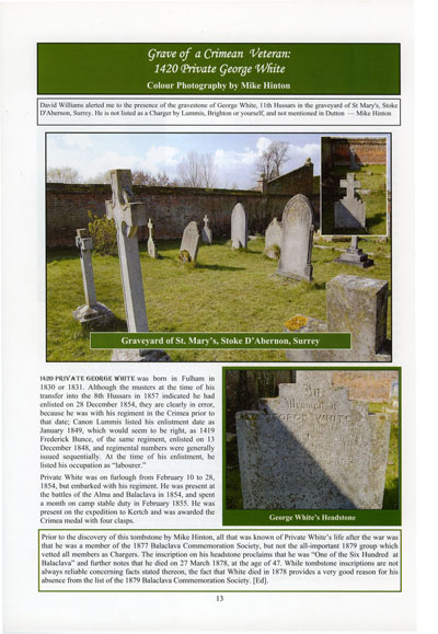David Williams alerted me to the presence of the gravestone of George White, 11th Hussars in the graveyard of St Mary's, Stoke D'Abemon, Surrey. He is not listed as a Charger by Lummis, Brighton or yourself [i.e. LC], and not mentioned in Dutton - Mike Hinton.