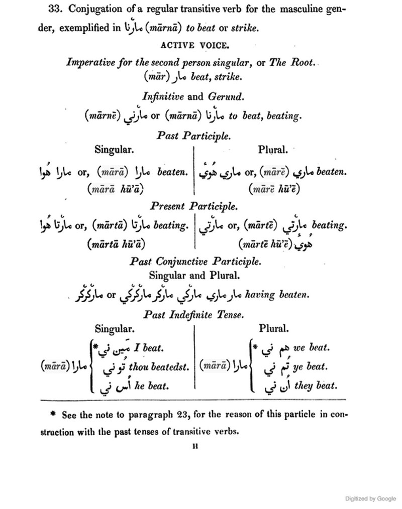 See Shakespear's Introduction to Hindustani, published by and behalf of the East India Company in 184?, to educate its functionaries in [native languages]. Notice he uses the word to demonstrate a regular transitive verb for the masculine gender. Is it unlikely that Maria Chalmers was taught using this primer?