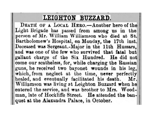 Another hero of the Light Brigade has passed away from among us in the person of Mr William Williamson, who died at St Bartholomew's Hospital on the 17th inst.