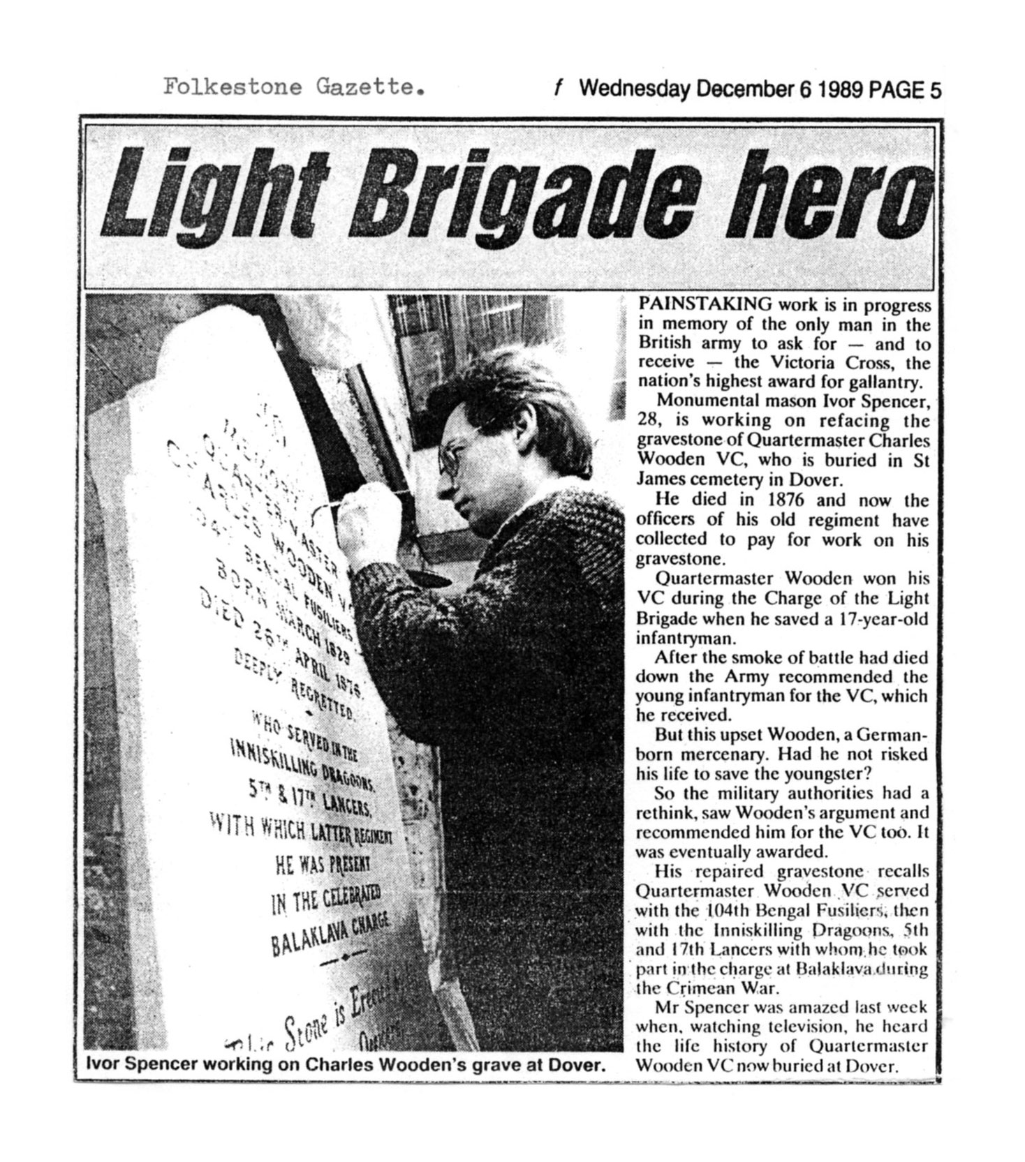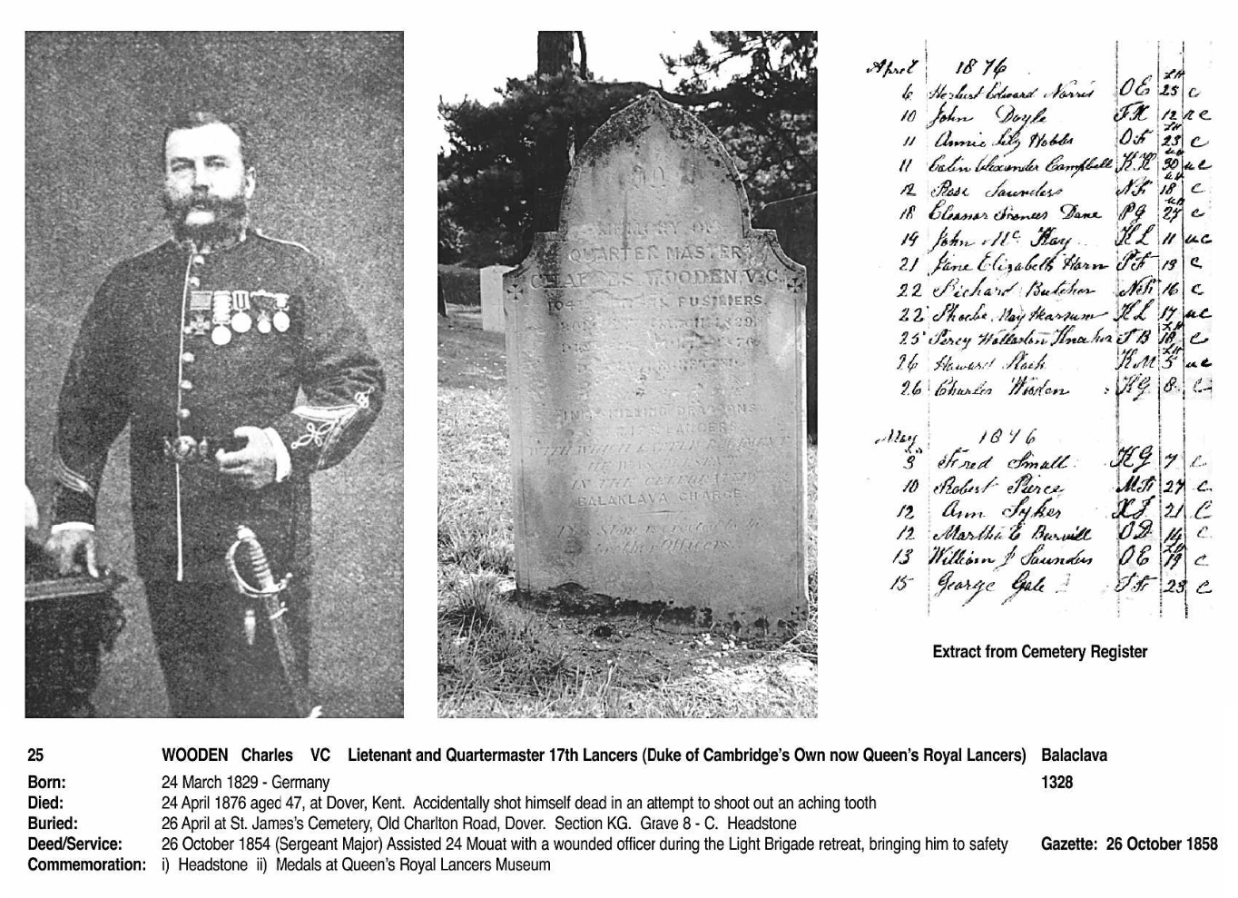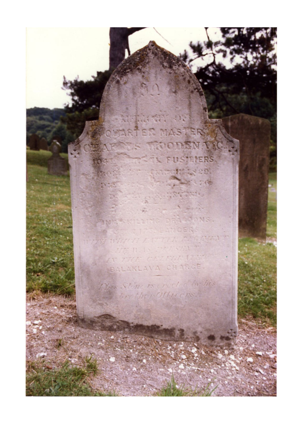 "In memory of Quartermaster Charles Wooden. V.C. 104th (Bengal Fusiliers) Born * (illegible) of March 1829 — Died 26th of April 1876 at Western Heights. Formerly of the Inniskilling Dragoons, 5th Lancers and 17th Lancers, with which latter regiment he was in the celebrated Balaclava Charge. This stone is erected by his brother officers."