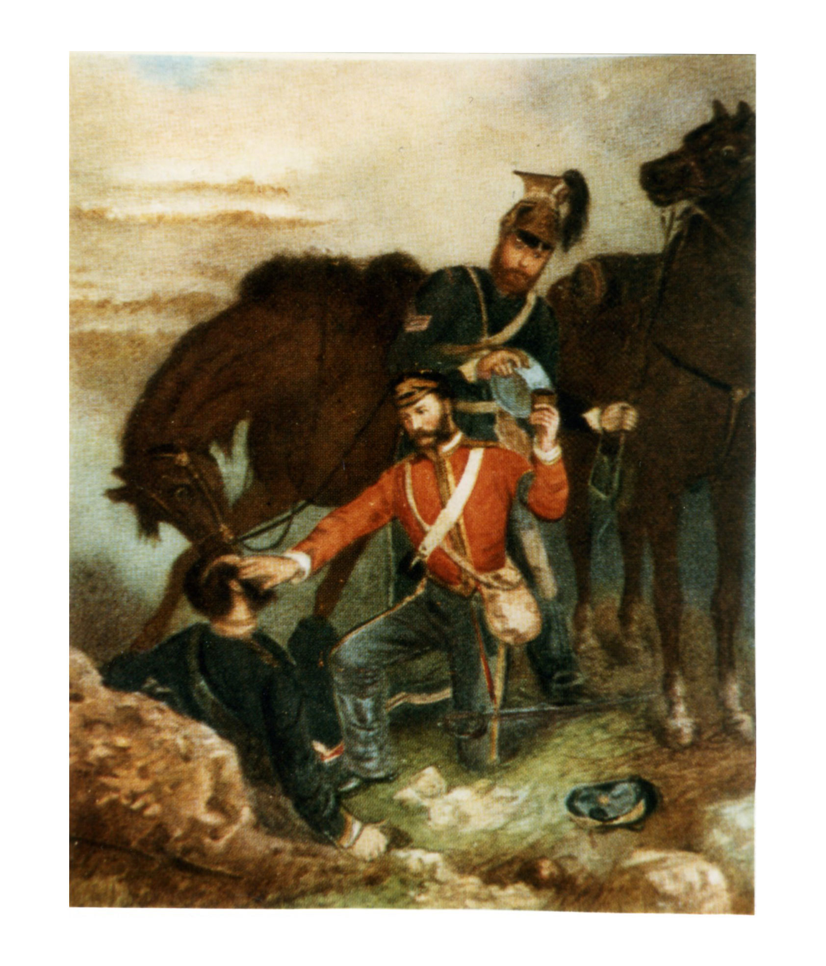 A related scene is depicted on an obelisk erected to the memory of Morris on Hatherleigh Moor in Mid-Devon. Part of this comprises of a large bronze plaque and shows him being carried off the battlefield by Doctor Mouat [sp?] and Charles Wooden. (There are photographs in the 17th Lancer file.)