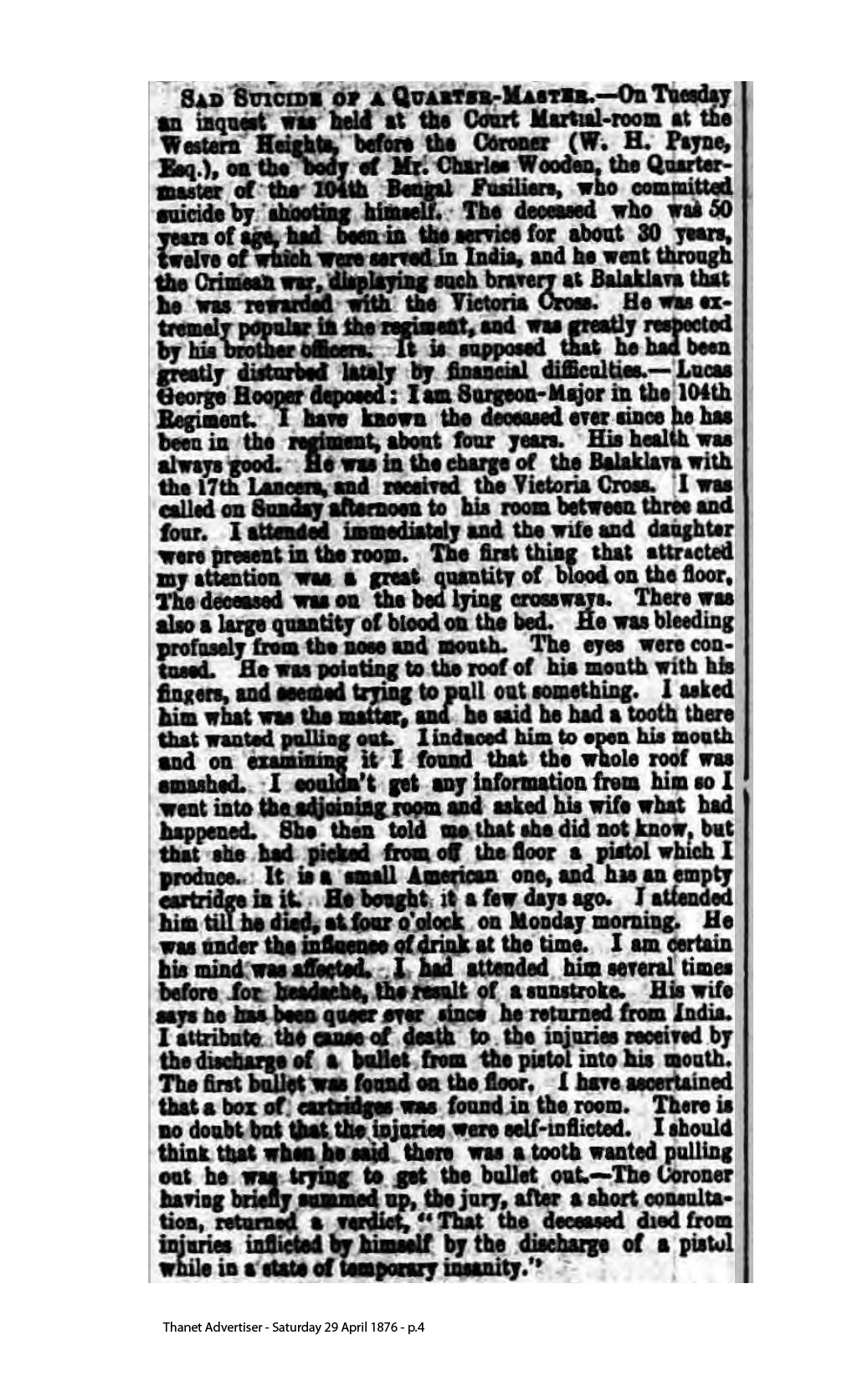 — Lucas George Hooper deposed: I am Surgeon-Major been in the 104th Regiment. I have known the deceased ever since he has been in the regiment, about four yean. His health was always good. He was in the charge of the Balaklava [sic] with the 17th Lancers, and received the Victoria Cross. I was called on Sunday afternoon to his room between three and four. I attended immediately and the wife and daughter were present in the room.
