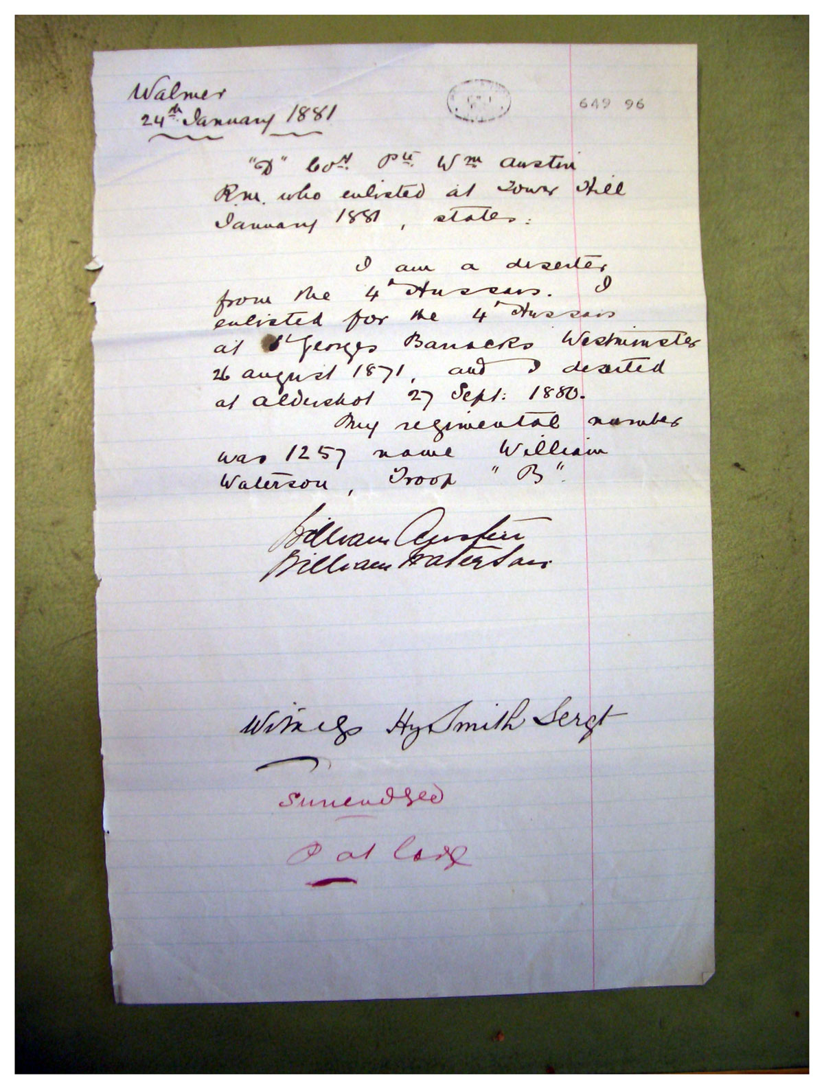 Walmer 24th January 1881"D" Coy Pte William Austin RM, who enlisted at Tower Hill January 1881, states: