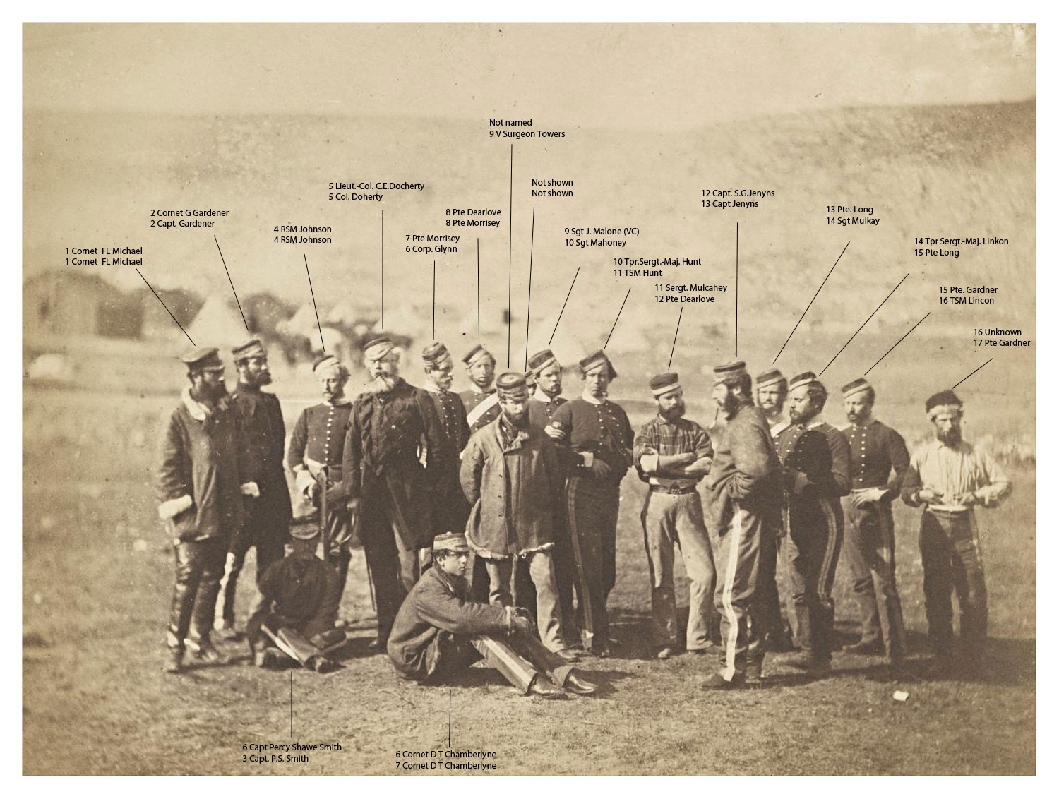 The 13th Light Dragoons served in all of the major battles of the Crimean War including the Charge of the Light Brigade. This photograph is sometimes captioned 'Remnant of the 13th Light Dragoons taken in front of their camp on the morning after the Charge at Balaclava, October 26th, 1854'. This would not have been possible, as Fenton did not arrive in the Crimea until 8 March 1855. A key held by the National Army Museum, with this photograph, identifies the men thus: Cornet F L Michael; Capt. Gardner; Capt. P S Smith; RSM Johnson; Col. Doherty; Corp. Glynn; Cornet D T Chamberlayne; Pte. Morrisey; V.Surgn. Towers; Sgt. Mahoney; TSM Hunt; Pte. Dearlove; Capt. Jenyns; Sgt. Mulkay; Pte. Long; [TSM Linkon]; Pte. Gardner. Jenyns was the most senior officer to survive from the 13th.