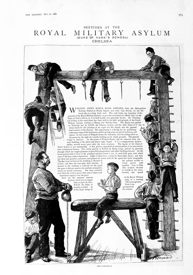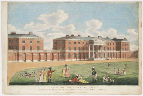 Between 1803 and 1909 the Royal Military Asylum was located near the Royal Hospital Chelsea at what is now known as the Duke of York's Headquarters (which currently serves as the Saatchi Gallery). Initially a co-educational boarding school (girls were removed to a sister asylum in Southampton in 1823), it was renamed The Duke of York's Royal Military School in 1892, and in 1909 relocated to Dover, Kent, where it still functions - incidentally, it returned to co-education in 1994.
