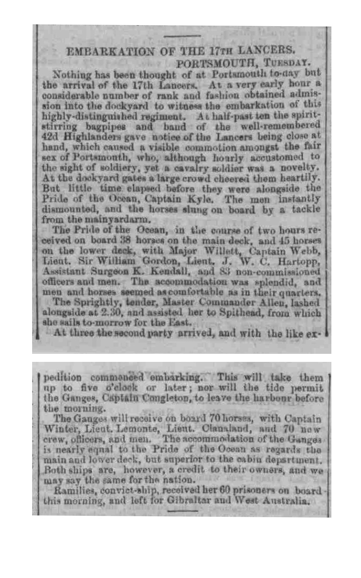 The 17th Lancers Captain Winter's troop, consisting of Lieutenants Learmouth and Hartopp, Ensign Sir George Hector Lee, Bart, Assistant Surgeon Dr. Kendal, and 70 men and horses, embarked yesterday morning at 11 o'clock from Portsmouth Dockyard in the fine clipper ship Pride of the Ocean for Turkey. Captain Webb's troop, consisting of Lieutenant Thompson, Cornet Wombwell, and 65 men and horses, embarked at 4 o'clock from the Dockyard jetty on board the transport Ganges. These vessels were towed to Spithead, whence they sail for their destination. On marching into the garrison of Portsmouth through the chief street of Portsea they were enthusiastically greeted by the population. Cavalry never being quartered now in Portsmouth district, the appearance of the Lancers excited much admiration among the inhabitants. The embarcation was personally superintended by Colonel Laurenson, of the Lancers, and the Brigade-Major of Portsmouth garrison. The transports for the head-quarters of the Lancers has not arrived at Portsmouth yesterday. (The Times, April 19, 1854, p.9, Column B)