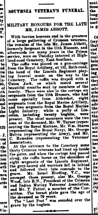 The funeral of the late veteran, J. Abbott, of the 11th Hussars, will take place at the Highland Road Cemetery at 2 p.m. tomorrow. The cortege will leave No. 132 Bath Road, Southsea, at 1.45 p.m. The deceased was one of the members of his regiment who actually charged with the Light Brigade at Balaclava. He was also present at the battles of the Alma, Inkerman and Sebastopol. All veterans are invited to attend, also members of both services, to show their respects to one who had served his country so well.