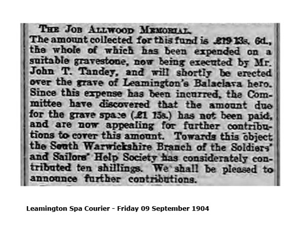 The amount collected for this fund is £19 13s. 6d., the whole of which has been expended on a suitable gravestone, now being executed by Mr. John T. Tandey, and will shortly erected over the grave of Leamington's Balaclava hero. Since this expense has been incurred, the Committee have discovered that the amount due for the grave space (£1 15s.) has not been paid, and are now appealing for further contributions to cover this amount. Towards this object the Sooth Warwickshire Branch of the Soldiers' and Sailors' Help Society has considerately contributed ten shillings. We shall be pleased to announce further contributions.