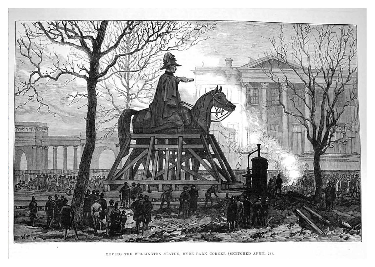 Note: The reference to the Iron Duke and his "dishonour" is to the removal in 1883 of an equestrian statue of Wellington that originally surmounted the Constitution Hill Arch in London. The intention had been to melt the statue down for the bronze, but as it was found to contain more iron than bronze it was not considered worthwhile and it was purchased by public subscription and re-erected at Aldershot. It was replaced in 1912 with Winged Victory with chariot and horses.