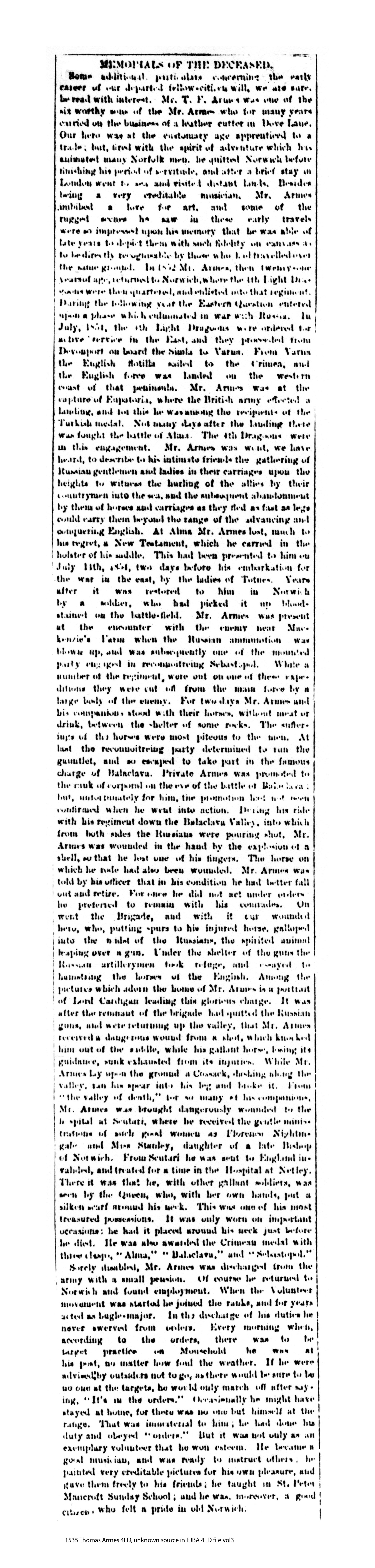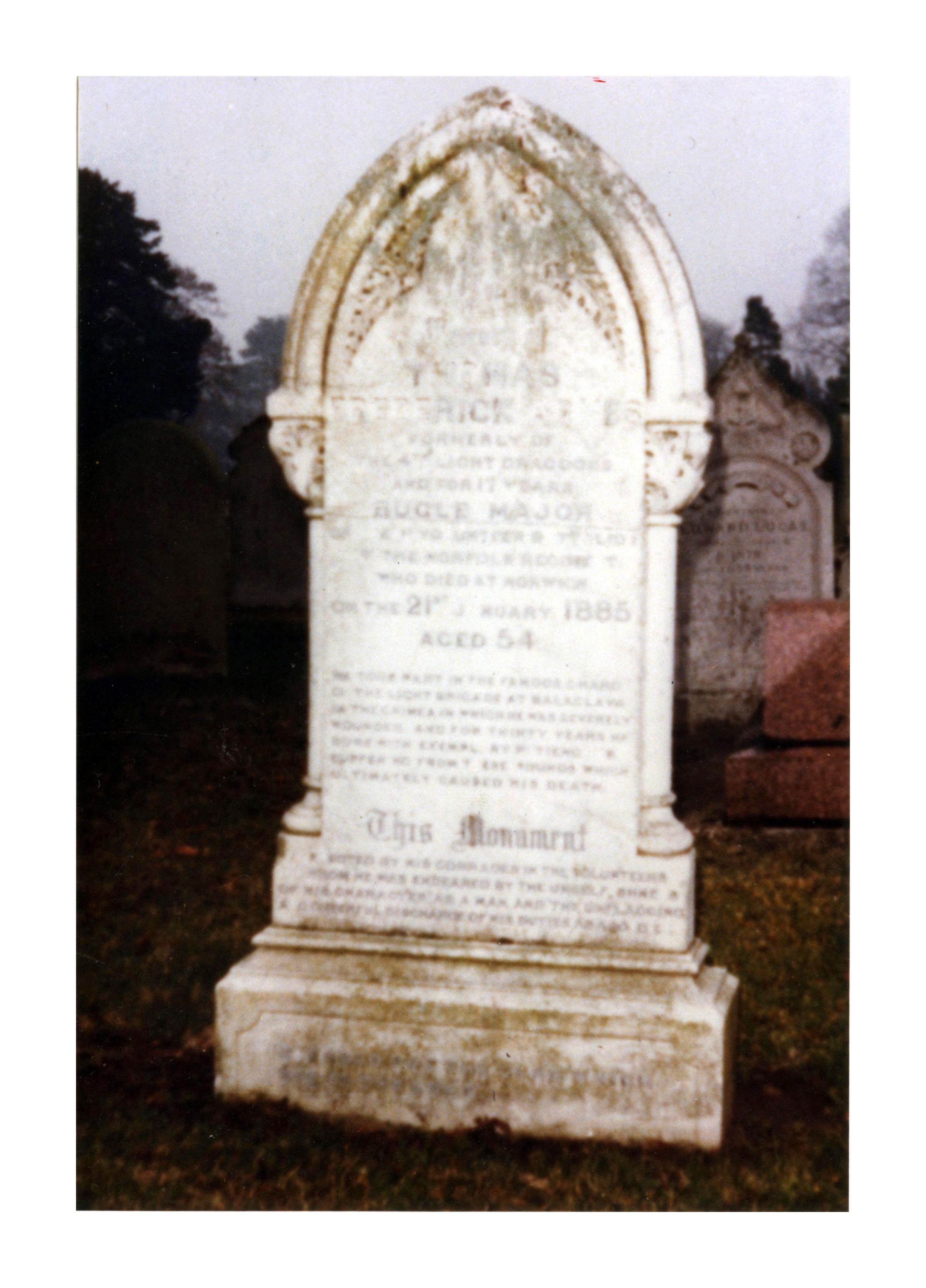 "Died at All Saint's Green, Norwich, Thomas Frederick Armes, Bugle Major of the 1st Volunteer Battalion of the Norfolk Regiment. Formerly in the 4th Light Dragoons, he took part in the famous light cavalry charge at Balaclava, in which he was wounded and left for dead on the field."