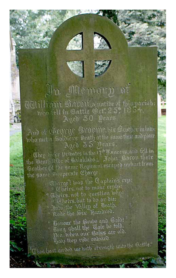 It is not only the directly deceased who are commemorated on the memorials covered in this paper. For example, a memorial stone in All Saints' Churchyard, North Collingham (Nottinghamshire) not only marks the death of two related individuals who died in the CLB (William Bacon and George Broome), but also records the safe return of a third family member (John Bacon) who had taken part in this battle. Interestingly, at the base of the stone is a poem which is clearly based on Tennyson's "The Charge of the Light Brigade" but with significant differences.
