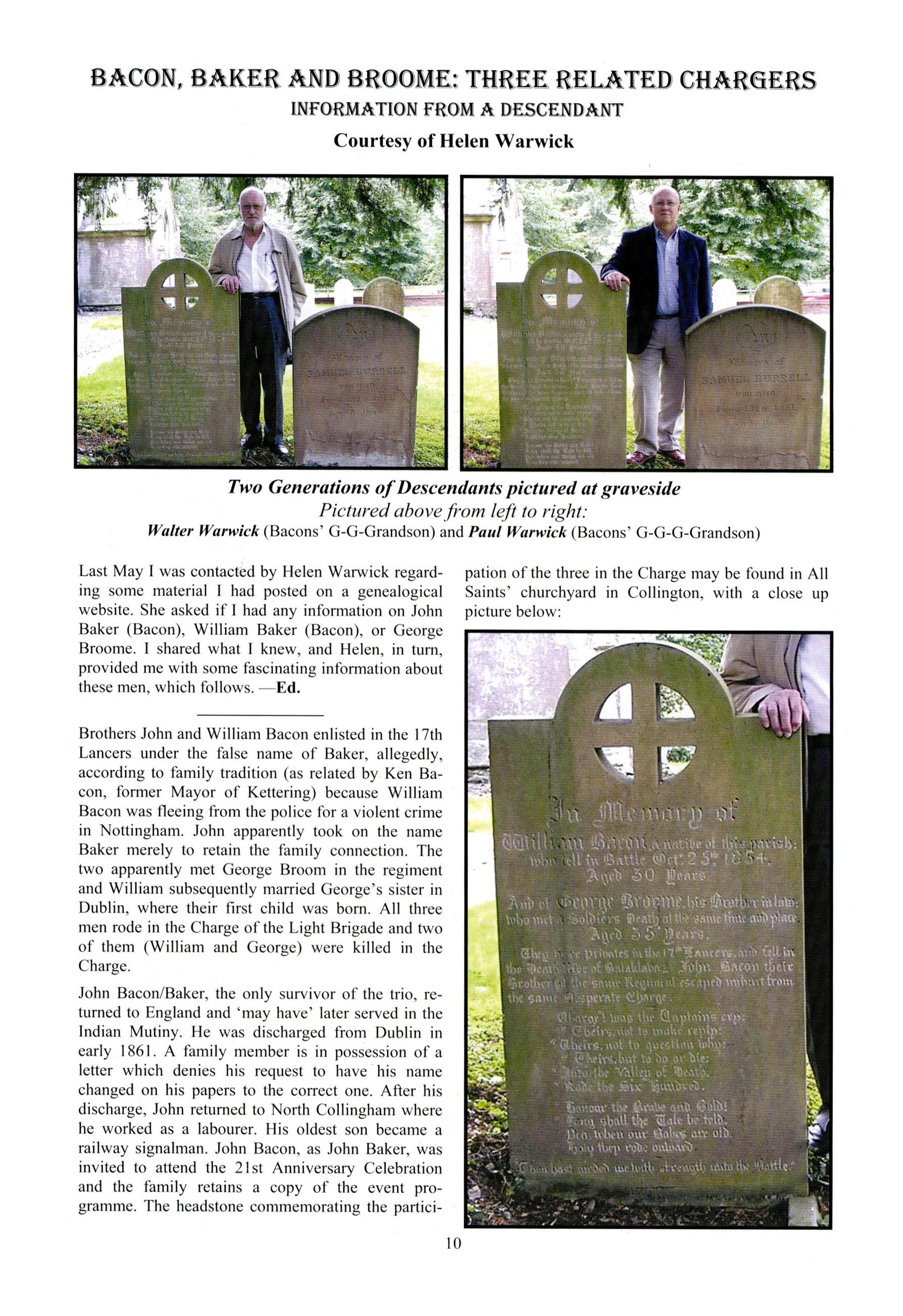 Two Generations of Descendants pictured at graveside Pictured above from left to right: Walter Warwick (Bacons' G-G-Grandson) and Paul Warwick (Bacons' G-G-G-Grandson)