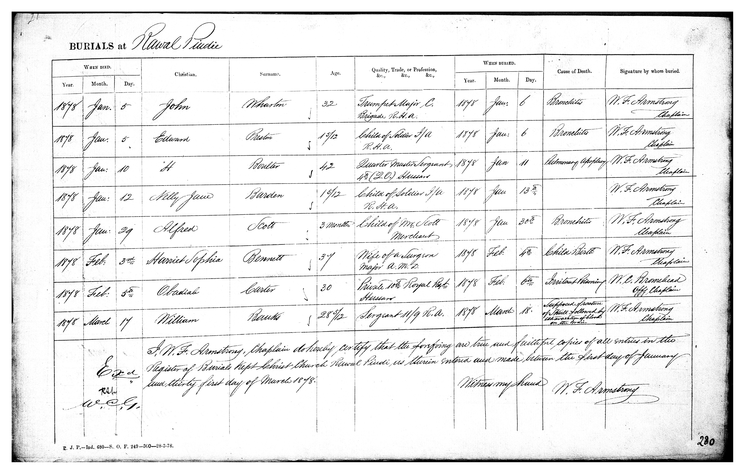 The India Office records show him as dying of "Bronchitis" at Rawalpindi [near modern Islamabad, Pakistan] on the 10th of January 1878, aged 42 years, and buried there on the 11th of January by the Revd. W.F. Armstrong, Chaplain.