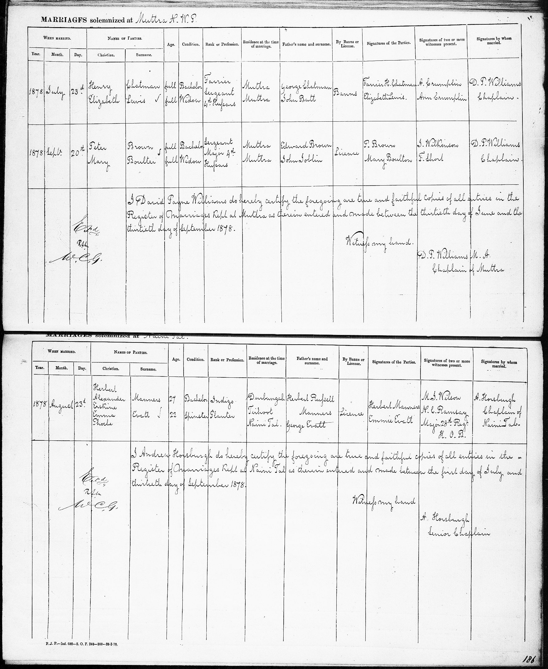 [PB: Since there was no obvious candidate for "TSM John Brown", in April 2020 Wendy Leahy (ShadowsofTime) sought further details of this marriage. She discovered that Mary Boulter (widowed daughter of John Joblin) married not a John but a Peter Brown (bachelor son of Edward Brown): "Just checked the Indian marriages and have attached the copy. It turns out it was Peter Brown, No. 531, I suspect. He was Irish, joined in 1860 in Dublin aged 18, and at the point of being posted to India was a Sergeant. That's about all I have for him. No births of children, or deaths for either of them, are jumping out at the moment, but will have a closer look." I am very grateful to her for this information.]