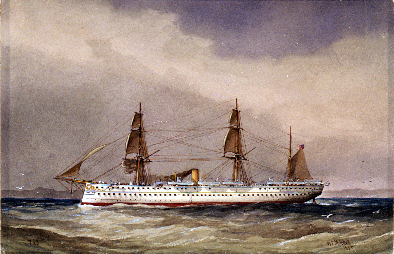 [Source: Wikimedia: HMS_Serapis_troop_ship_1866._No.758.jpg. According the Royal Museums Greenwich, this appears to be the "The Yacht of H.R.H. The Prince of Wales, during his visit to India 1875-76".]