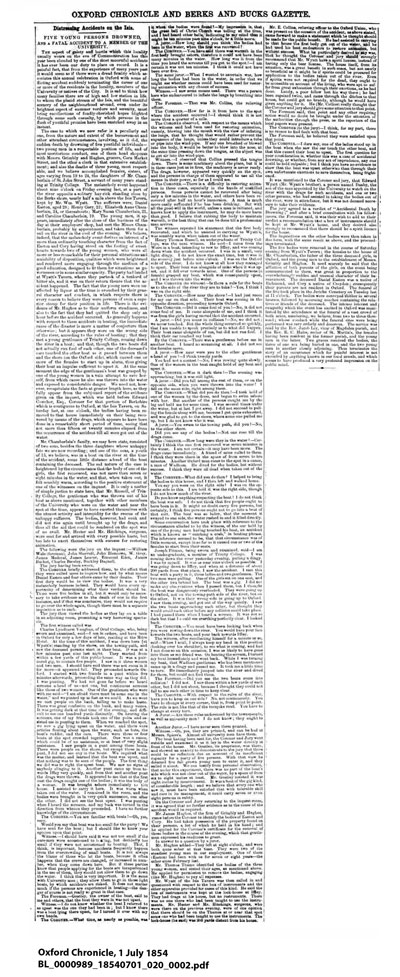 The first witness was Mr. Charles Lyndhurst Vaughan, of Oriel College, who deposed to being in a punt returning Oxford, and hearing screams he hastened to the spot and saw a boat floating keel uppermost and several persons on the bank. He considered the boat was too small, save for experienced persons. Accidents often happened by overcrowding the boats, and it frequently happened that boats which required the greatest skill and management were let to members of the University who could neither row nor swim. The bodies were about ten minutes in the water.