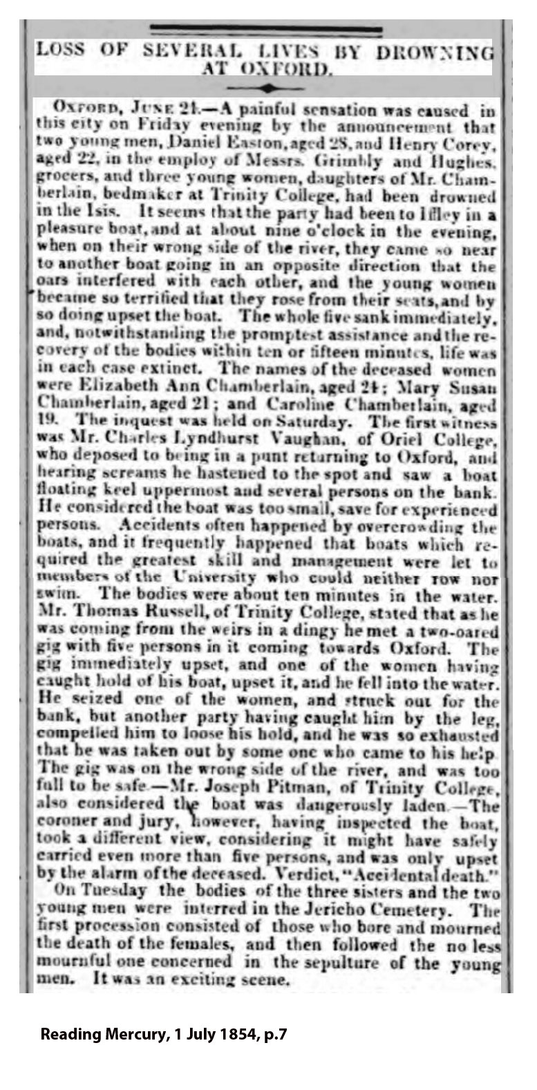 OXFORD, JUNE 21 - A painful sensation was caused in this city on Friday evening by the announcement that two young men, Daniel Easton, aged 28, and Henry Corey [sic], aged 22, in the employ of Messrs. Grimbly and Hughes, grocers, and three young women, daughters of Mr. Chamberlain, bedmaker at Trinity College, had been drowned in the Isis.