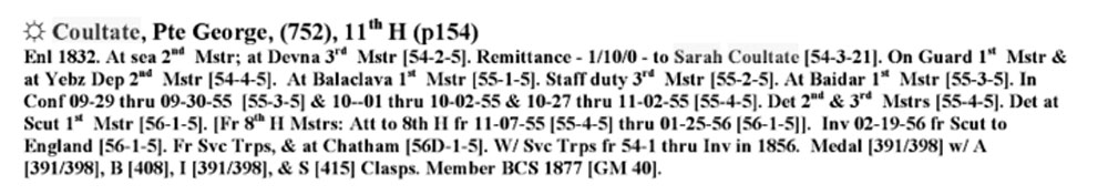 In the Crimea, his next of kin was his wife, Sarah Coultate, born c.1820. [PB: Try to find out more about their marriage.]