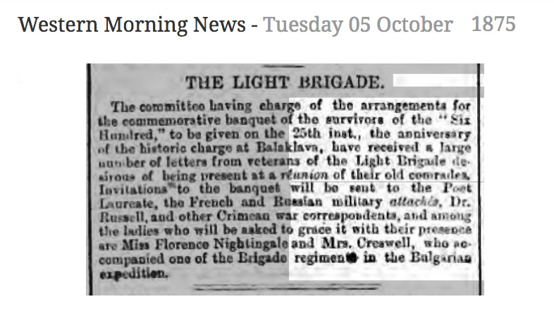 "Among the many embarkations for the East few could have been more gratifying than that of Captain Cresswell's troop, 11th (P.A.0.) Hussars, which sailed 3 p.m. board the Panola. The perfect regularity and ease with which the embarkation of both men and horses was conducted were unexceptionable. But the enthusiasm on the occasion was more than usually excited by the gallant captain being accompanied by Mrs. Cresswell, daughter of Sir William G. Gordon Cumming, who, though the only lady, with the spirit of her race, accompanies the regiment to the East. Loud and long were the cheers of her gallant "comrades," re-echoed from the shore, which greeted her on reaching the vessel, and many were the heavy hearts and watery eyes that followed the vessel to the pier-head as the moved out Saturday."