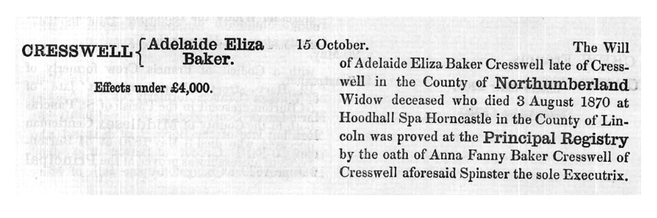 Memorials to him and to his sister Emma Elizabeth, who died in 1820, and to his brother William Gilfred, who was a captain in the XIth Hussars and died in 1854 aged 29 (b.1825) before the battle of Alma in the Crimea, are in the church at Cresswell.