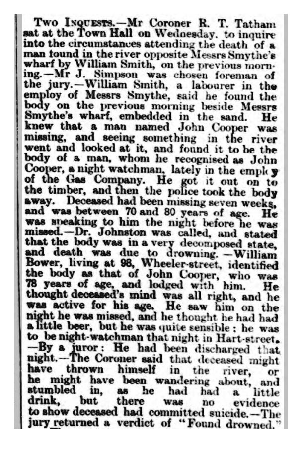 — William Smith, a labourer in the employ of Messrs Smythe, said he found the body on the previous morning beside Messrs Smythe's wharf, embedded in the sand. knew that a man named John Cooper was missing, and seeing something in the river went and looked at it, and found it to be the body of man, whom recognised as John Cooper, a night watchman, lately in the pay of the Gas Company. He got it out on to the timber, and then the police look the body away. Deceased had been missing seven weeks, and was between 70 and 80 years of age. was speaking to him the night before he was missed.