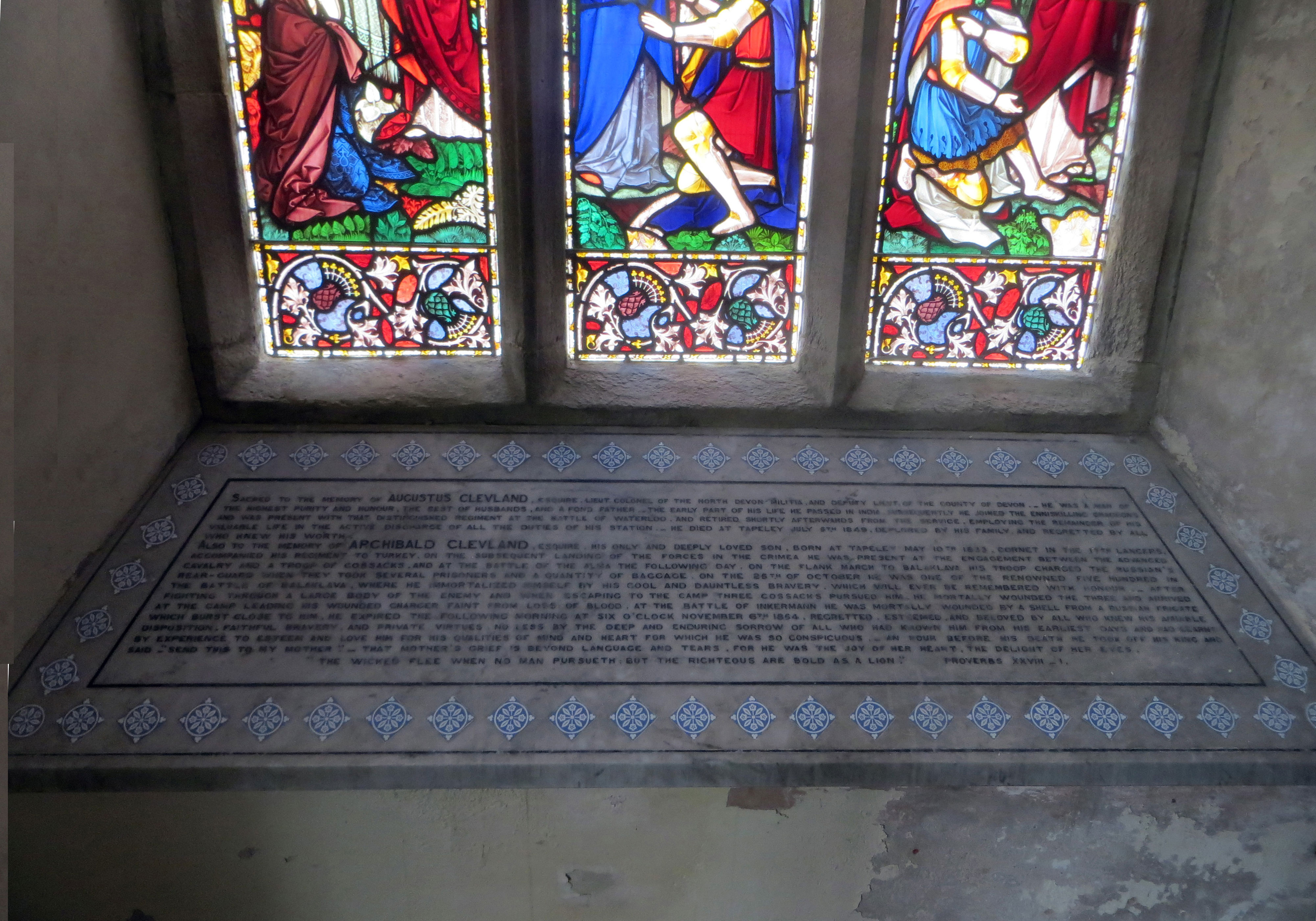 Archibald Clevland (1833-1854), of Tapeley, only son, a cornet in the 17th Lancers, who died aged 21 at the Battle of Inkerman, having just one month before been one of the few officers who survived the Charge of the Light Brigade. He died unmarried and without progeny, and was therefore the last of the Clevland (and Saltren-Willett) family. Several monuments exist to his memory, including an elaborate sculpted and inscribed marble mural monument and a large stained glass window in Westleigh Church, and two monuments in the grounds of Tapeley Park, namely a 50-foot high obelisk (destroyed by lightning in 1933, with only the base remaining [50]), and a statue erected near the lake by his mother, in the form of a mourning lady,[51] with base inscribed as follows: [52]