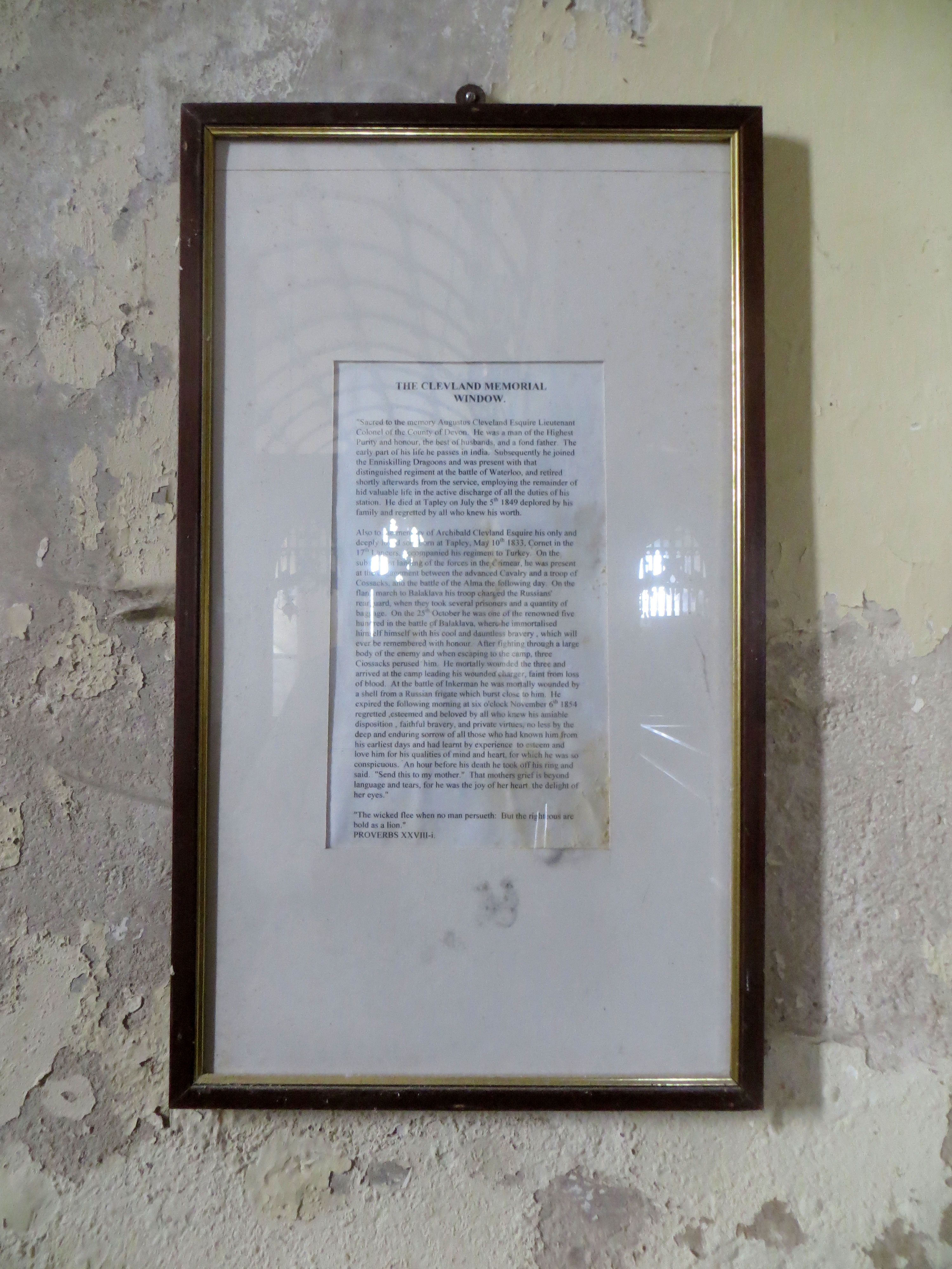 Cleveland had survived the CLB only to be fatally wounded at the Battle of Inkerman on 5 November, but the memorial inscription is very long and detailed, giving his brief military career whilst on active service in the Crimea. Of extreme relevance here is that two sentences refer to Inkerman and his death from a shell fragment; three refer to his part in the CLB: