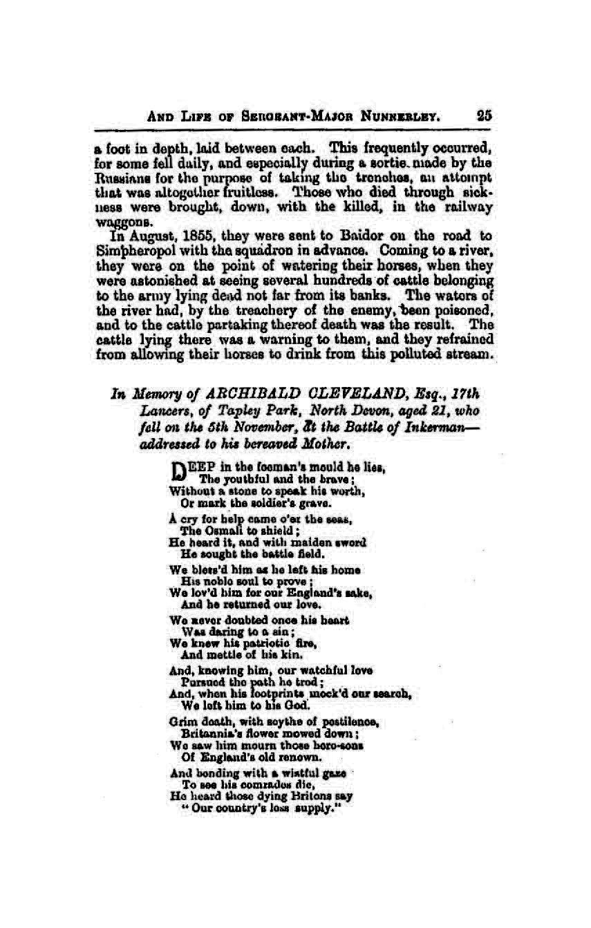 Archibald Clevland died of wounds received at the battle of Inkerman, on the 6th of November 1854 (see above).
