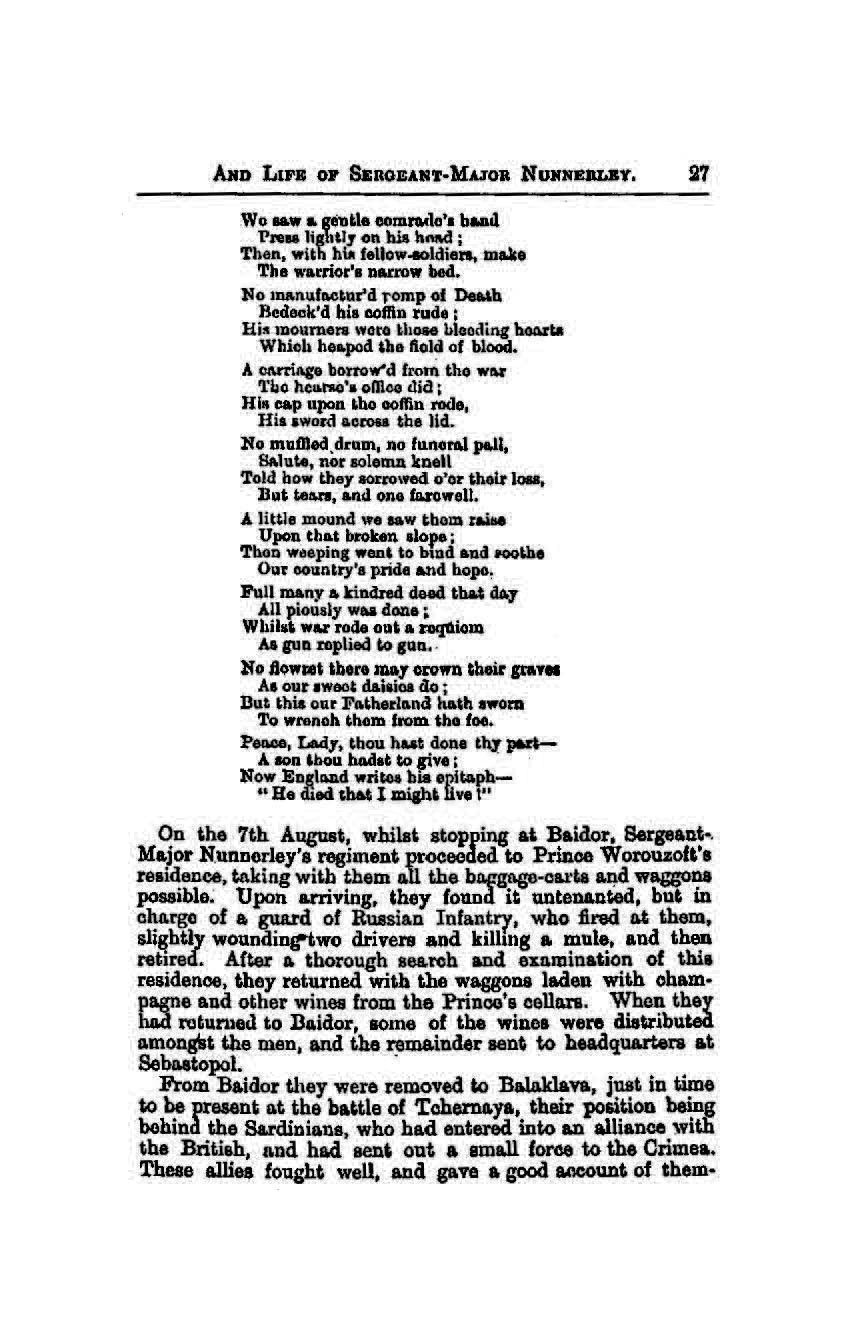 Three Cossacks attacked him, thus handicapped, but he wounded the first, received a lance thrust through his cartouch box, and a prod in the ribs from the third, which bruised him, coming out otherwise unhurt, only to fall a few days later in that useless advance of our Light Brigade which we owed to the express solicitation of the French general.