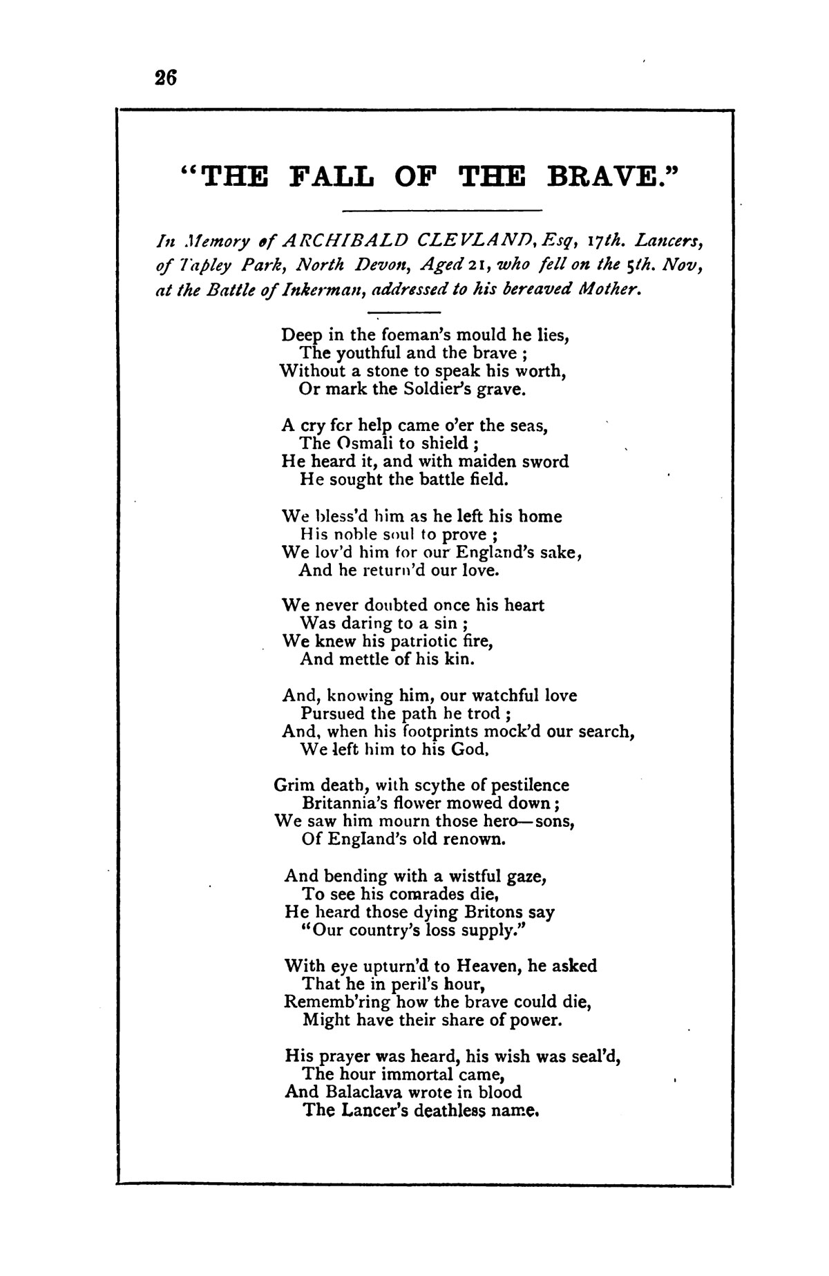 [T]here is a memorial to Cornet Archibald Cleveland, 17th Lancers, at St John's Church, Instow (Devon) which well epitomises Houston's observations.