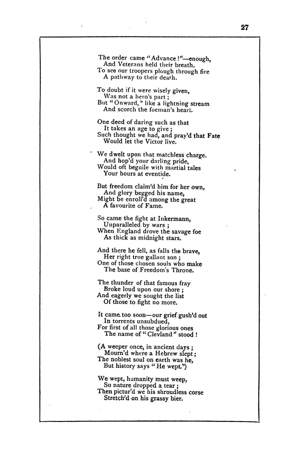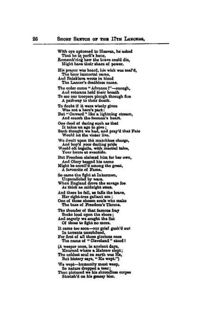 In a letter to his brother dated December 20, Sergeant William Garland, 17th Lancers, wrote: "The 17th Lancers lost a very fine young officer named Cleaveland [sic]"