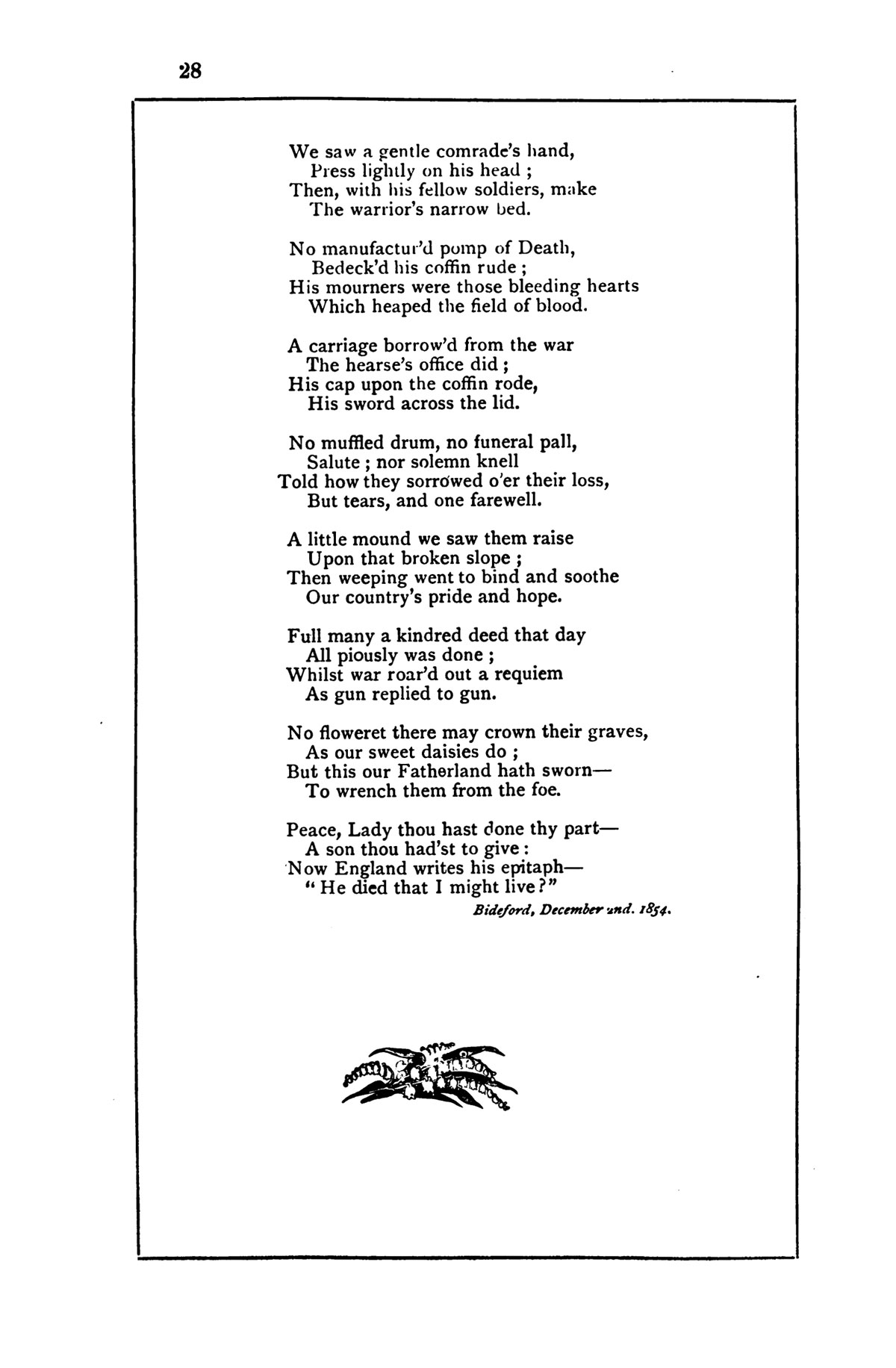 [PB: Find my notes on how this was set to music and widely sung in "Glees" — three-part (or four-part) harmony. I wonder if there is some allusion to this in the choice of quotation for the weeping woman memorial — the mother, father, son, singing together?]