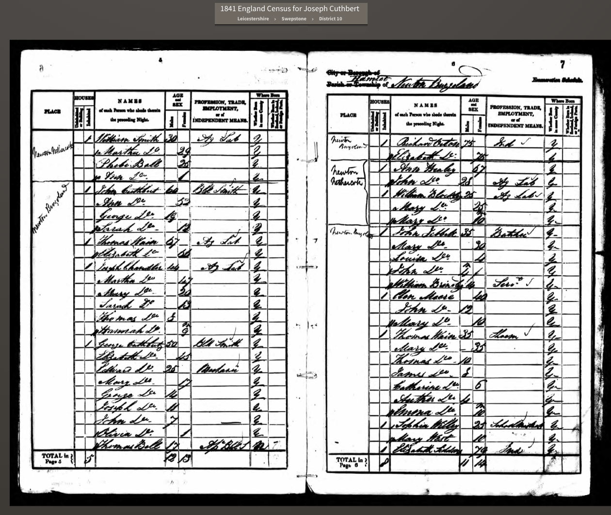 [PB, May 2018: I do not know what EJB's source was for the above. Take care: There appears to be a different Joseph Cuthbert, also born 1829 Newton, Leicestershire, but he survived to ?1901. A relative? See e.g. 1861 Census for Swadlincote Derbyshire (https://www.ancestry.co.uk/interactive/8767/STSRG9_1960_1962-0433). Interestingly, he too is a Blacksmith. In 1841 his father, John, was also a Blacksmith. His mother's name was Matilda.