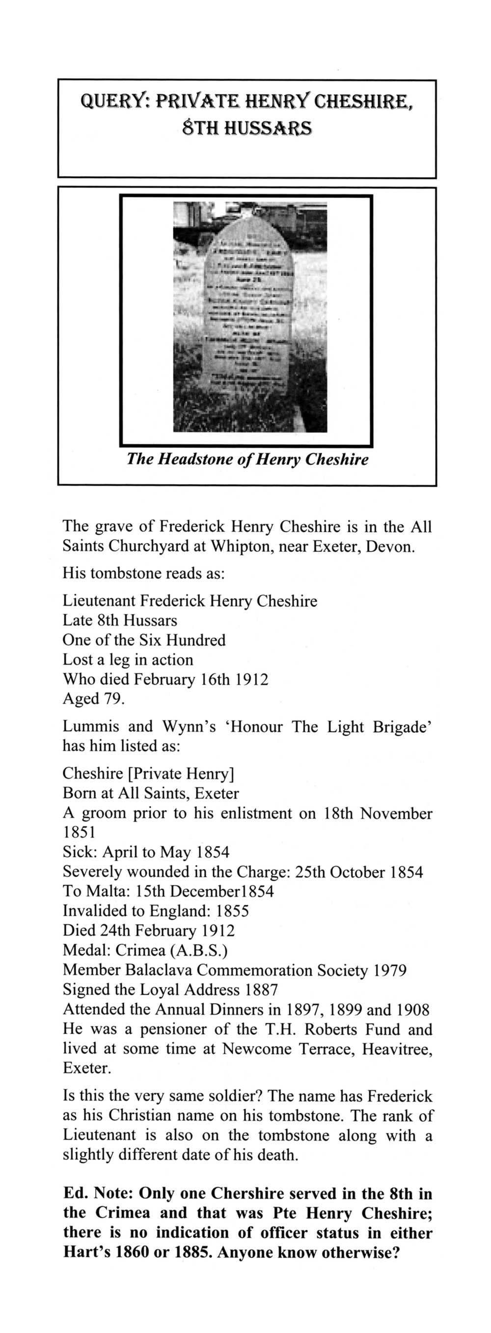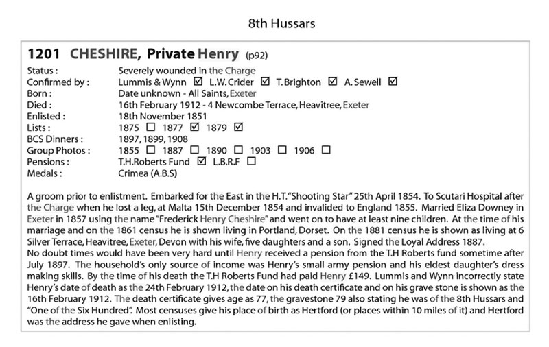 At the CLB, there were four Lieutenants (Clutterbuck, Fitzgibbon (see above), Heneage and Philips) and two Cornets (Clowes and Mussenden) involved. In checking Hart's Army List for the years 1853, 1855 and 1861, no record of such an officer could be found. Neither could any mention of this officer be recovered from Rev. Robert Murray's (2004: 724) official Regimental History of the 8th Hussars and List of its Officers for the Crimean War. However, using the extremely thorough EJ Boys Archive (aka 'Lives of the Light Brigade') conserved by Roy Mills & Philip Boys for the CWRS, one Private Henry Cheshire [No. 1201] 8th Hussars is discovered.