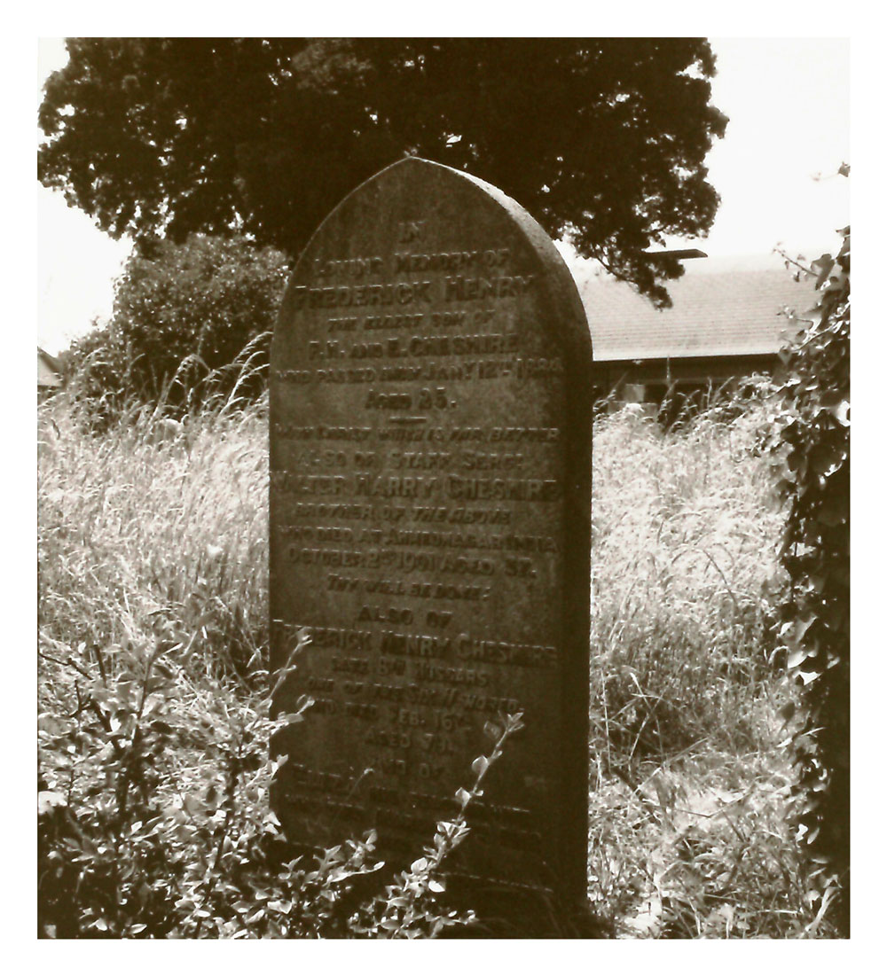 "In loving memory of Frederick Henry, the eldest son of F.H. and E. Cheshire, who passed away January 12th 1882, aged 25 years.