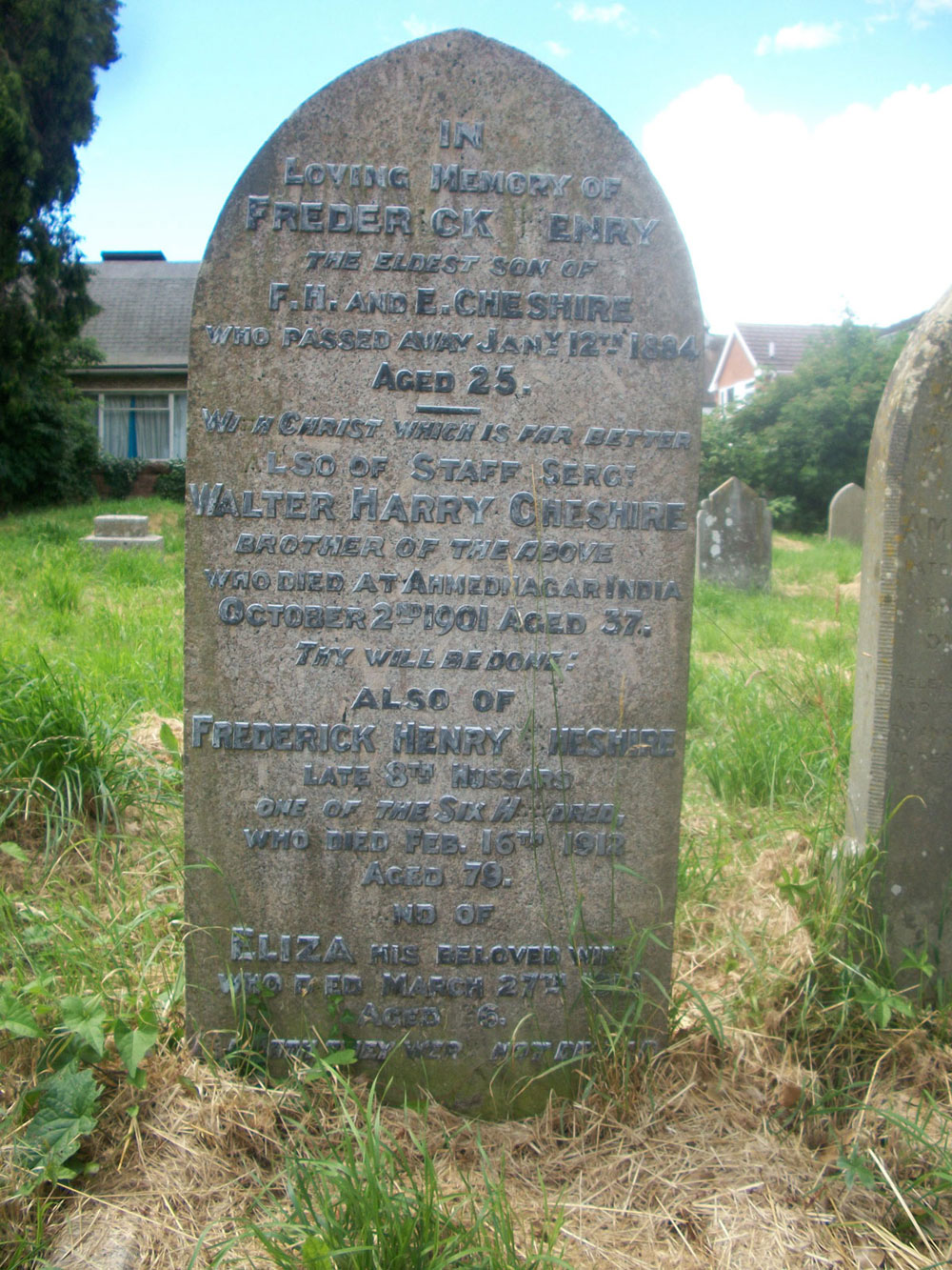 Also of Frederick Henry Cheshire, late 8th Hussars. — One of the Six Hundred. — who died February the 16th 1912, and of Eliza, his beloved wife, who died 27th of March 1912, aged 76 years."