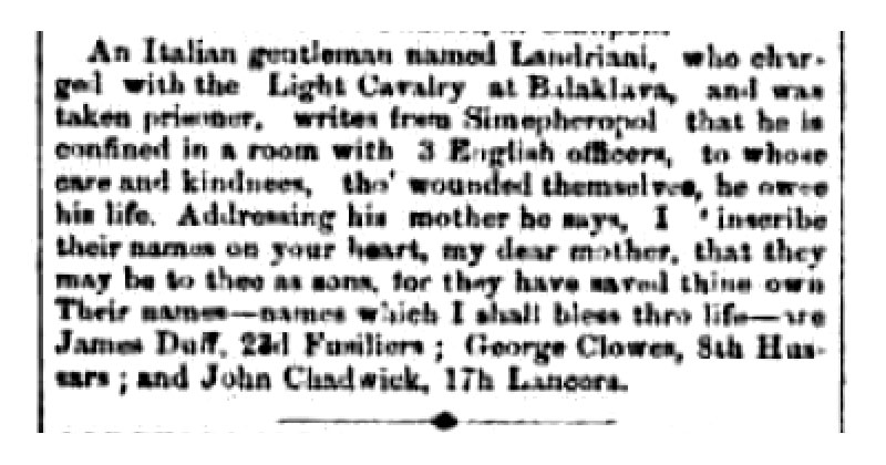 An Italian gentleman named Landriani, who charged with the Light Cavalry at Bdaklava, and was taken prisoner, writes from Simepheropol [sic] that he is confined in a room with 3 English officers, to whose care and kindness, tho' wounded themselves, he owed his life. Addressing his mother he says, I 'inscribe their names on your heart, my dear mother, that they may be to thee as sons, for they have saved thine own. Their names — names which I shall bless thro life — are James Duff, 23d Fusiliers; George Clowes, 8th Hussars; and John Chadwick, 17th Lancers.