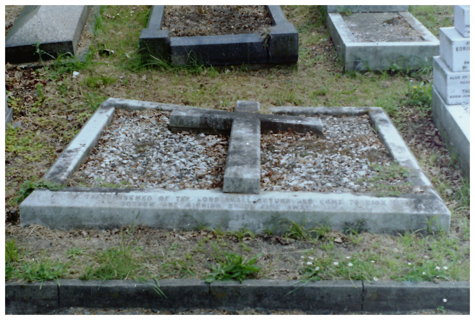 A memorial was erected over the grave, consisting of a marble kerb, inscribed on three sides. and a cross, some four feet in height, placed in the centre. (1983: The latter has been vandalised and is now lying flat.)