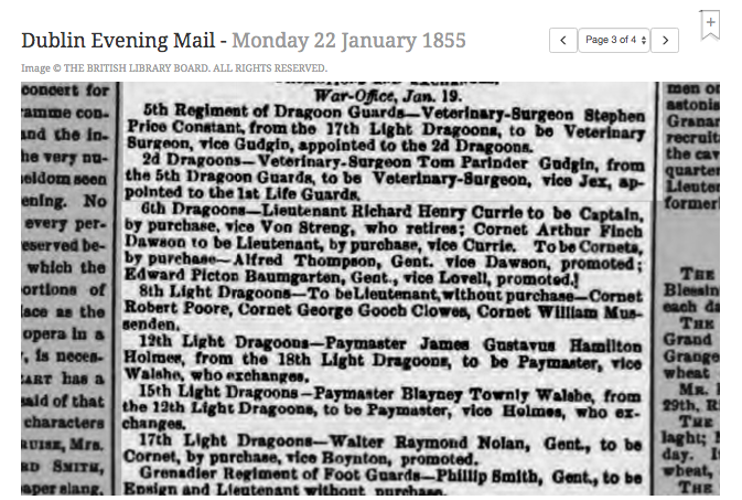 Dublin Evening Mail, 22 Jan 1855, reports GGC has been made lieutenant without purchase. This was repeated in numerous newspaprs/ Original source> [PB: But he was a POW at this time! But became Lieutenant o his return late October.]