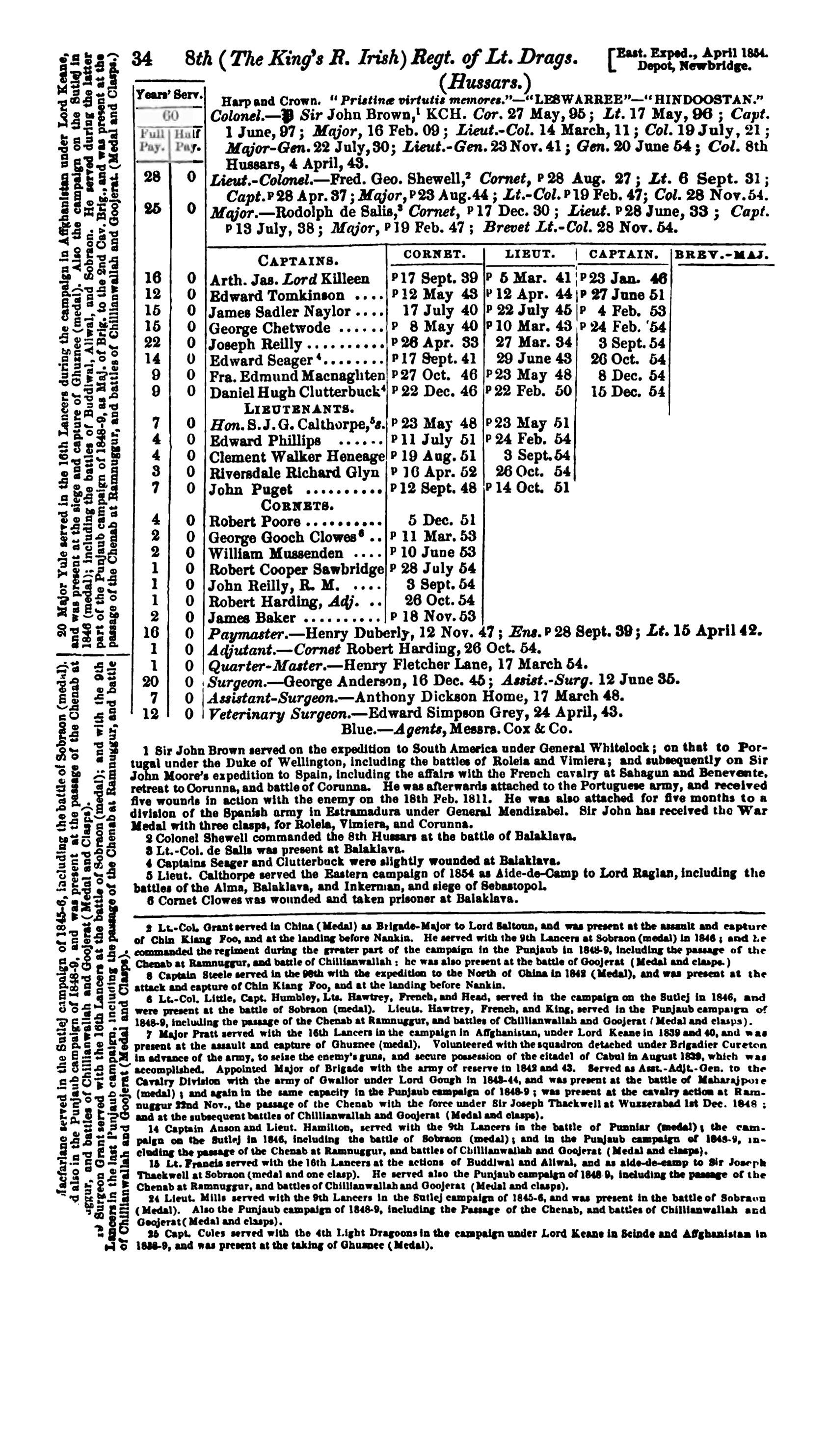 Entitled to the Crimean medal with clasps for the Alma, Balaclava and Sebastopol, the Turkish Medal and the Mutiny Medal with clasp for Central India.